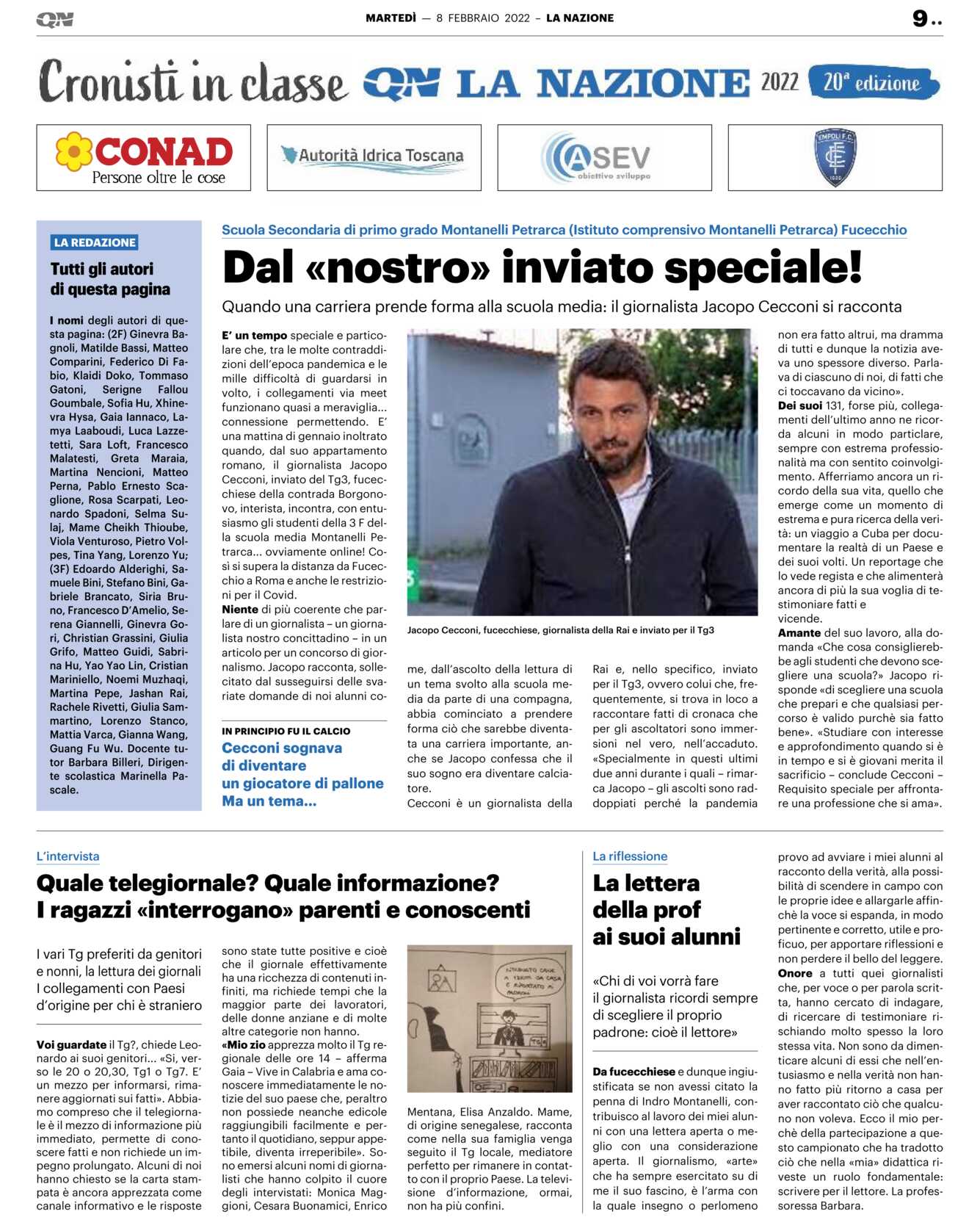 Niente di più coerente che parlare di un giornalista – un giornalista nostro concittadino – in un articolo per un concorso di giornalismo. Jacopo racconta, sollecitato dal susseguirsi delle svariate domande di noi alunni come, dall’ascolto della lettura di un tema svolto alla scuola media da parte di una compagna, abbia cominciato a prendere forma ciò che sarebbe diventata una carriera importante, anche se Jacopo confessa che il suo sogno era diventare calciatore. Cecconi è un giornalista della Rai e, nello specifico, inviato per il Tg3, ovvero colui che, frequentemente, si trova in loco a raccontare fatti di cronaca che per gli ascoltatori sono immersioni nel vero, nell’accaduto. «Specialmente in questi ultimi due anni durante i quali – rimarca Jacopo – gli ascolti sono raddoppiati perché la pandemia non era fatto altrui, ma dramma di tutti e dunque la notizia aveva uno spessore diverso. Parlava di ciascuno di noi, di fatti che ci toccavano da vicino».