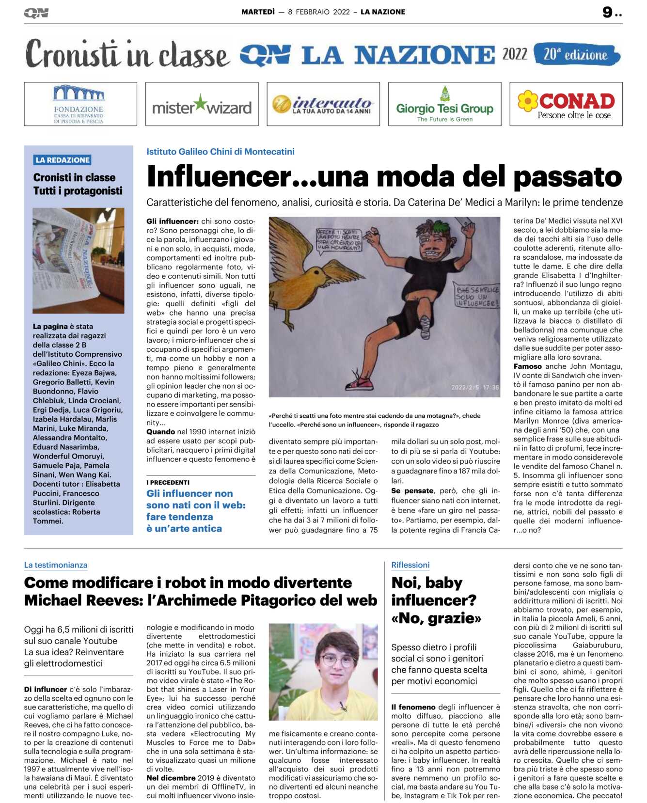 Gli influencer: chi sono costoro? Sono personaggi che, lo dice la parola, influenzano i giovani e non solo, in acquisti, mode, comportamenti ed inoltre pubblicano regolarmente foto, video e contenuti simili. Non tutti gli influencer sono uguali, ne esistono, infatti, diverse tipologie: quelli definiti «figli del web» che hanno una precisa strategia social e progetti specifici e quindi per loro è un vero lavoro; i micro-influencer che si occupano di specifici argomenti, ma come un hobby e non a tempo pieno e generalmente non hanno moltissimi followers; gli opinion leader che non si occupano di marketing, ma possono essere importanti per sensibilizzare e coinvolgere le community…