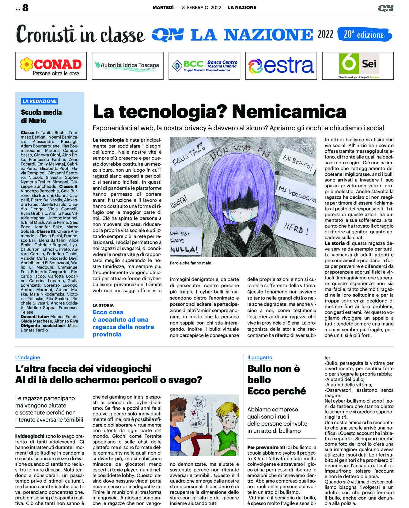 La tecnologia è nata principalmente per soddisfare i bisogni dell’uomo. Nelle nostre vite è sempre più presente e per questo dovrebbe costituire un mezzo sicuro, non un luogo in cui i ragazzi siano esposti a pericoli o si sentano indifesi. In questi anni di pandemia le piattaforme hanno permesso di portare avanti l’istruzione e il lavoro e hanno costituito una forma di rifugio per la maggior parte di noi. Ciò ha spinto le persone a non muoversi da casa, riducendo la propria vita sociale e utilizzando sempre più la rete per relazionarsi. I social permettono a noi ragazzi di svagarci, di condividere le nostre vite e di rapportarci meglio superando le nostre timidezze, ma sempre più frequentemente vengono utilizzati per attuare forme di cyberbullismo: prevaricazioni tramite web con messaggi offensivi o immagini denigratorie, da parte di persecutori contro persone più fragili. I cyber-bulli si nascondono dietro l’anonimato e possono sollecitare la partecipazione di altri ’amici’ sempre anonimi, in modo che la persona non sappia con chi stia interagendo. Inoltre il bullo virtuale non percepisce le conseguenze delle proprie azioni e non si cura della sofferenza della vittima. Questo fenomeno non avviene soltanto nelle grandi città o nelle zone degradate, ma anche vicino a noi, come testimonia l’esperienza di una ragazza che vive in provincia di Siena. La protagonista della storia che raccontiamo ha riferito di aver subito atti di bullismo sia fisici che via social. All’inizio ha ricevuto offese tramite messaggi sul telefono, di fronte alle quali ha deciso di non reagire. Ciò non ha impedito che l’atteggiamento dei coetanei migliorasse, anzi i bulli sono arrivati a invadere il suo spazio privato con vere e proprie molestie. Anche stavolta la ragazza ha deciso di non reagire per timore di essere richiamata al posto dei responsabili. Il ripetersi di queste azioni ha aumentato la sua sofferenza, a tal punto che ha trovato il coraggio di riferire ai genitori quanto accadeva sulla chat.