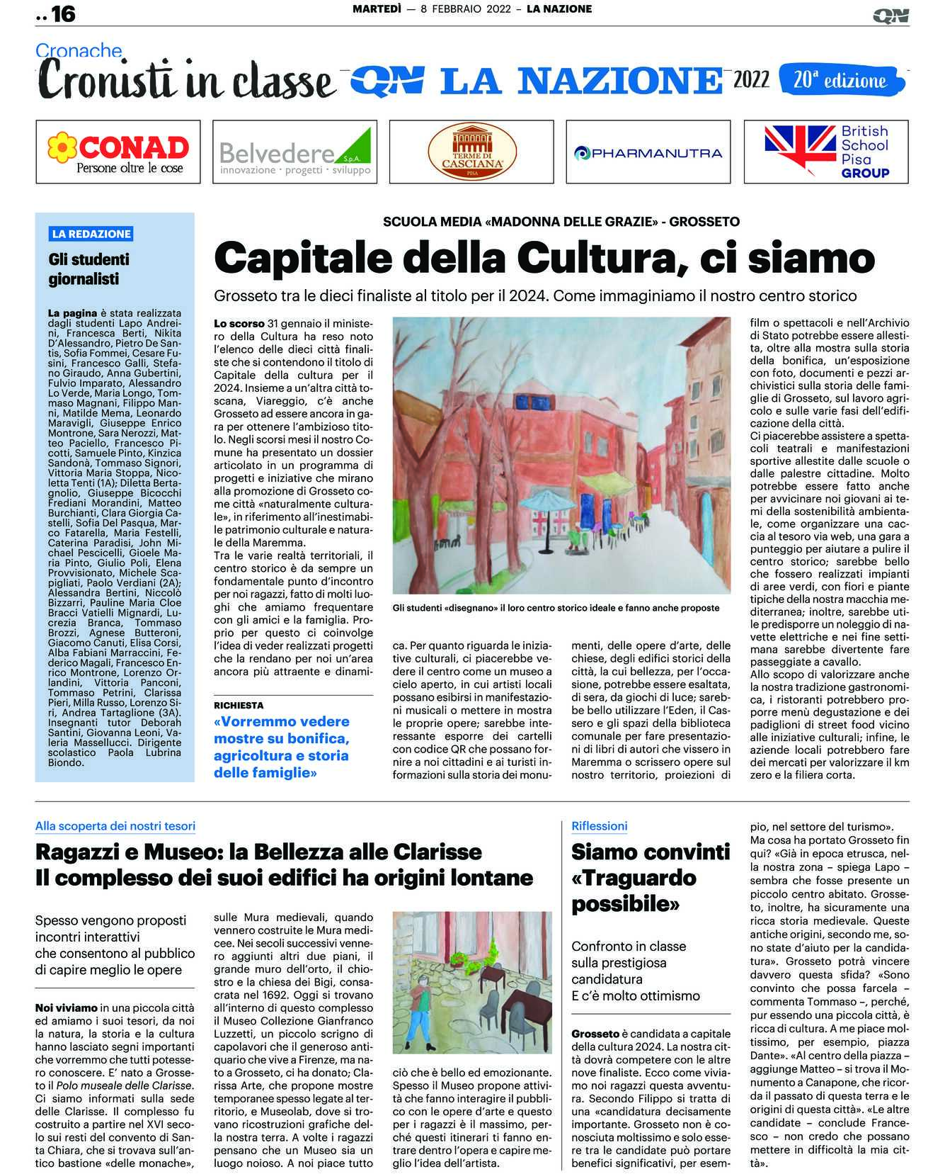 Lo scorso 31 gennaio il ministero della Cultura ha reso noto l’elenco delle dieci città finaliste che si contendono il titolo di Capitale della cultura per il 2024. Insieme a un’altra città toscana, Viareggio, c’è anche Grosseto ad essere ancora in gara per ottenere l’ambizioso titolo. Negli scorsi mesi il nostro Comune ha presentato un dossier articolato in un programma di progetti e iniziative che mirano alla promozione di Grosseto come città «naturalmente culturale», in riferimento all’inestimabile patrimonio culturale e naturale della Maremma. Tra le varie realtà territoriali, il centro storico è da sempre un fondamentale punto d’incontro per noi ragazzi, fatto di molti luoghi che amiamo frequentare con gli amici e la famiglia. Proprio per questo ci coinvolge l’idea di veder realizzati progetti che la rendano per noi un’area ancora più attraente e dinamica. Per quanto riguarda le iniziative culturali, ci piacerebbe vedere il centro come un museo a cielo aperto, in cui artisti locali possano esibirsi in manifestazioni musicali o mettere in mostra le proprie opere; sarebbe interessante esporre dei cartelli con codice QR che possano fornire a noi cittadini e ai turisti informazioni sulla storia dei monumenti, delle opere d’arte, delle chiese, degli edifici storici della città, la cui bellezza, per l’occasione, potrebbe essere esaltata, di sera, da giochi di luce; sarebbe bello utilizzare l’Eden, il Cassero e gli spazi della biblioteca comunale per fare presentazioni di libri di autori che vissero in Maremma o scrissero opere sul nostro territorio, proiezioni di film o spettacoli e nell’Archivio di Stato potrebbe essere allestita, oltre alla mostra sulla storia della bonifica, un’esposizione con foto, documenti e pezzi archivistici sulla storia delle famiglie di Grosseto, sul lavoro agricolo e sulle varie fasi dell’edificazione della città.
