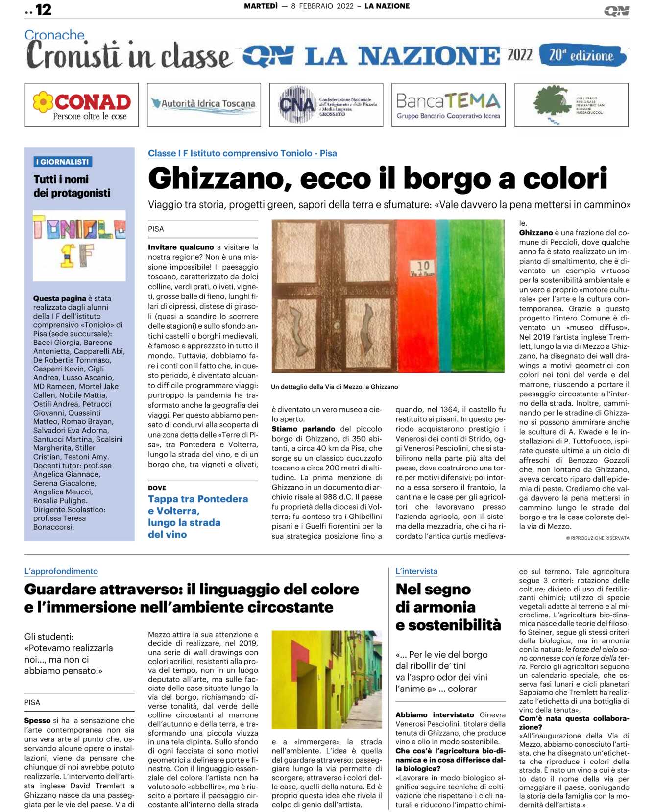Ghizzano è una frazione del comune di Peccioli, dove qualche anno fa è stato realizzato un impianto di smaltimento, che è diventato un esempio virtuoso per la sostenibilità ambientale e un vero e proprio «motore culturale» per l’arte e la cultura contemporanea. Grazie a questo progetto l’intero Comune è diventato un «museo diffuso». Nel 2019 l’artista inglese Tremlett, lungo la via di Mezzo a Ghizzano, ha disegnato dei wall drawings a motivi geometrici con colori nei toni del verde e del marrone, riuscendo a portare il paesaggio circostante all’interno della strada. Inoltre, camminando per le stradine di Ghizzano si possono ammirare anche le sculture di A. Kwade e le installazioni di P. Tuttofuoco, ispirate queste ultime a un ciclo di affreschi di Benozzo Gozzoli che, non lontano da Ghizzano, aveva cercato riparo dall’epidemia di peste. Crediamo che valga davvero la pena mettersi in cammino lungo le strade del borgo e tra le case colorate della via di Mezzo.