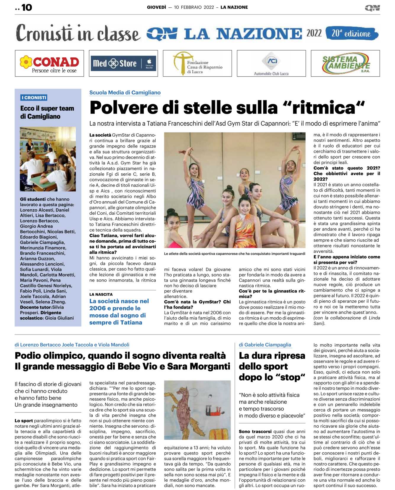 La società GymStar di Capannori continua a brillare grazie al grande impegno delle ragazze e alla sua struttura organizzativa. Nel suo primo decennio di attività la A.s.d. Gym Star ha già collezionato piazzamenti in nazionale Fgi di serie C, serie B, convocazione di ginnaste in serie A, decine di titoli nazionali Uisp e Aics , con riconoscimenti di merito societario negli Albo d’Oro annuali del Comune di Capannori, alle giornate olimpiche del Coni, dai Comitati territoriali Uisp e Aics. Abbiamo intervistato Tatiana Franceschini direttrice tecnica della squadra.