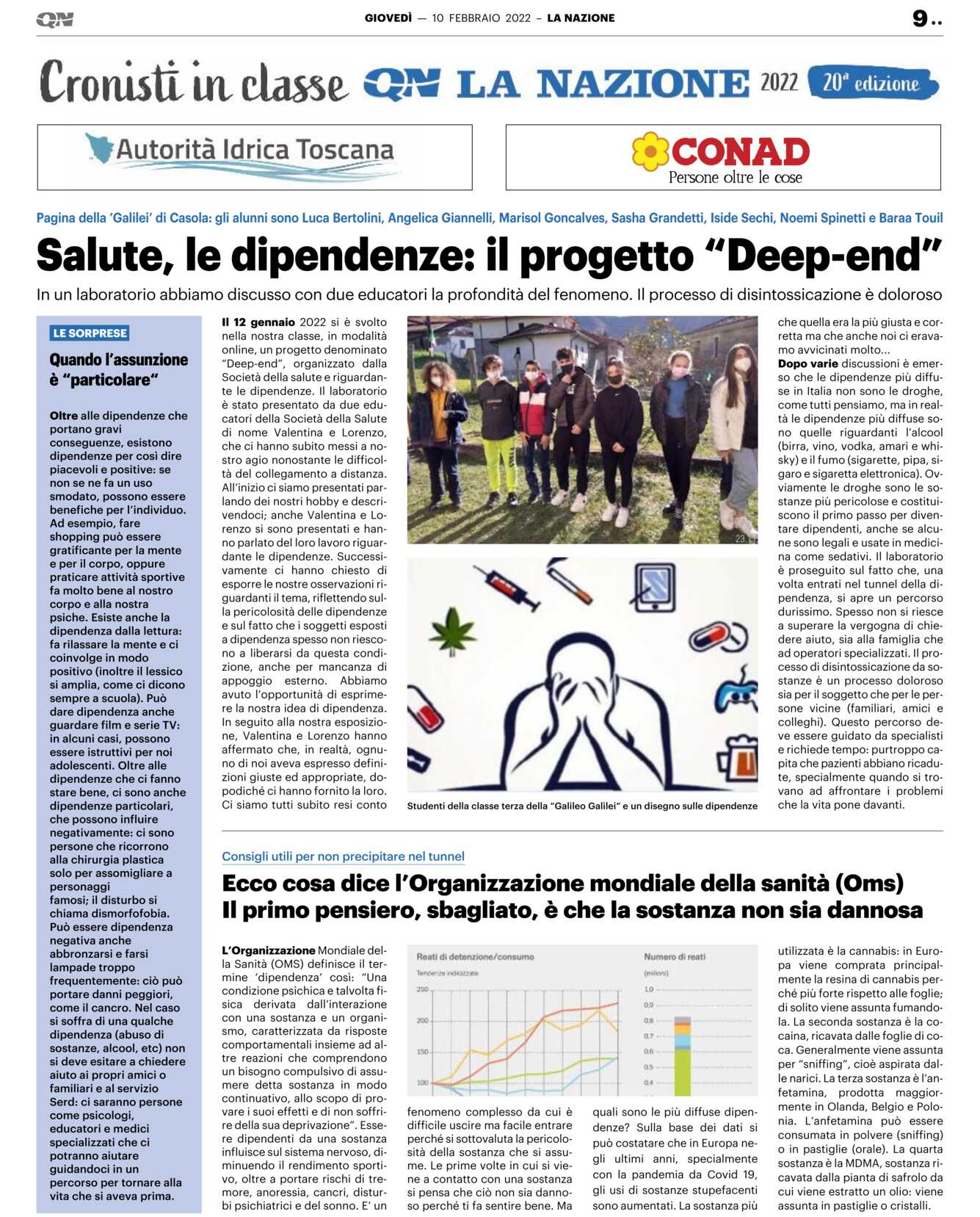 Il 12 gennaio 2022 si è svolto nella nostra classe, in modalità online, un progetto denominato “Deep-end”, organizzato dalla Società della salute e riguardante le dipendenze. Il laboratorio è stato presentato da due educatori della Società della Salute di nome Valentina e Lorenzo, che ci hanno subito messi a nostro agio nonostante le difficoltà del collegamento a distanza.