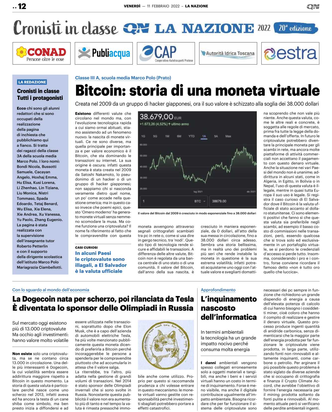 Esistono differenti valute che circolano nel mondo ma, con l’evoluzione tecnologica rapida a cui siamo ormai abituati, stiamo assistendo ad un fenomeno nuovo: la nascita di monete virtuali. Ce ne sono diverse, ma quella principale per importanza e per valore economico è il Bitcoin, che sta dominando le transazioni su internet. La sua origine è oscura; infatti questa moneta è stata creata nel 2009 da Satoshi Nakamoto, lo pseudonimo di un hacker o di un gruppo di hacker giapponesi; non sappiamo chi si nasconda veramente dietro quel nome, un po’ come accade nella questione omerica; ma in questo caso invece che poemi epici, questo ’Omero moderno’ ha generato monete virtuali senza nemmeno scomodare la musa. Ma come funziona una criptovaluta? Il nome fa riferimento al fatto che le compravendite con questamoneta avvengono attraverso segnali crittografati scambiati tra pc in rete o, come si usa dire in gergo tecnico, tra ’nodi’. Questo tipo di tecnologia rende sicure e affidabili le transazioni. A differenza delle altre valute, Bitcoin non è regolata da una banca centrale di uno stato o di una comunità. Il valore del Bitcoin, dall’anno della sua nascita, ècresciuto in maniera esponenziale, da 0 dollari, all’atto della sua messa in circolazione, fino a 38.000 dollari circa adesso.