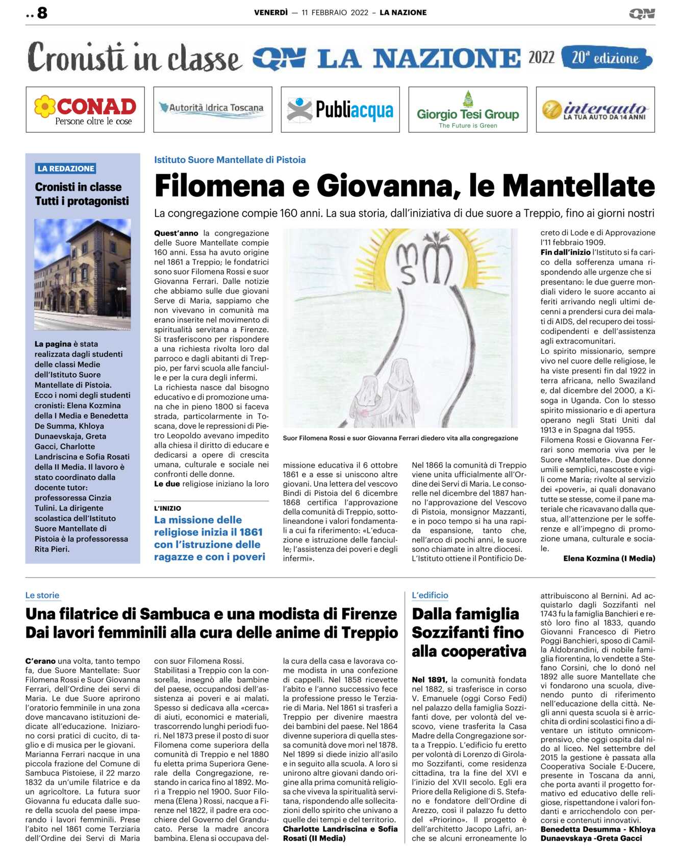 Quest’anno la congregazione delle Suore Mantellate compie 160 anni. Essa ha avuto origine nel 1861 a Treppio; le fondatrici sono suor Filomena Rossi e suor Giovanna Ferrari. Dalle notizie che abbiamo sulle due giovani Serve di Maria, sappiamo che non vivevano in comunità ma erano inserite nel movimento di spiritualità servitana a Firenze.