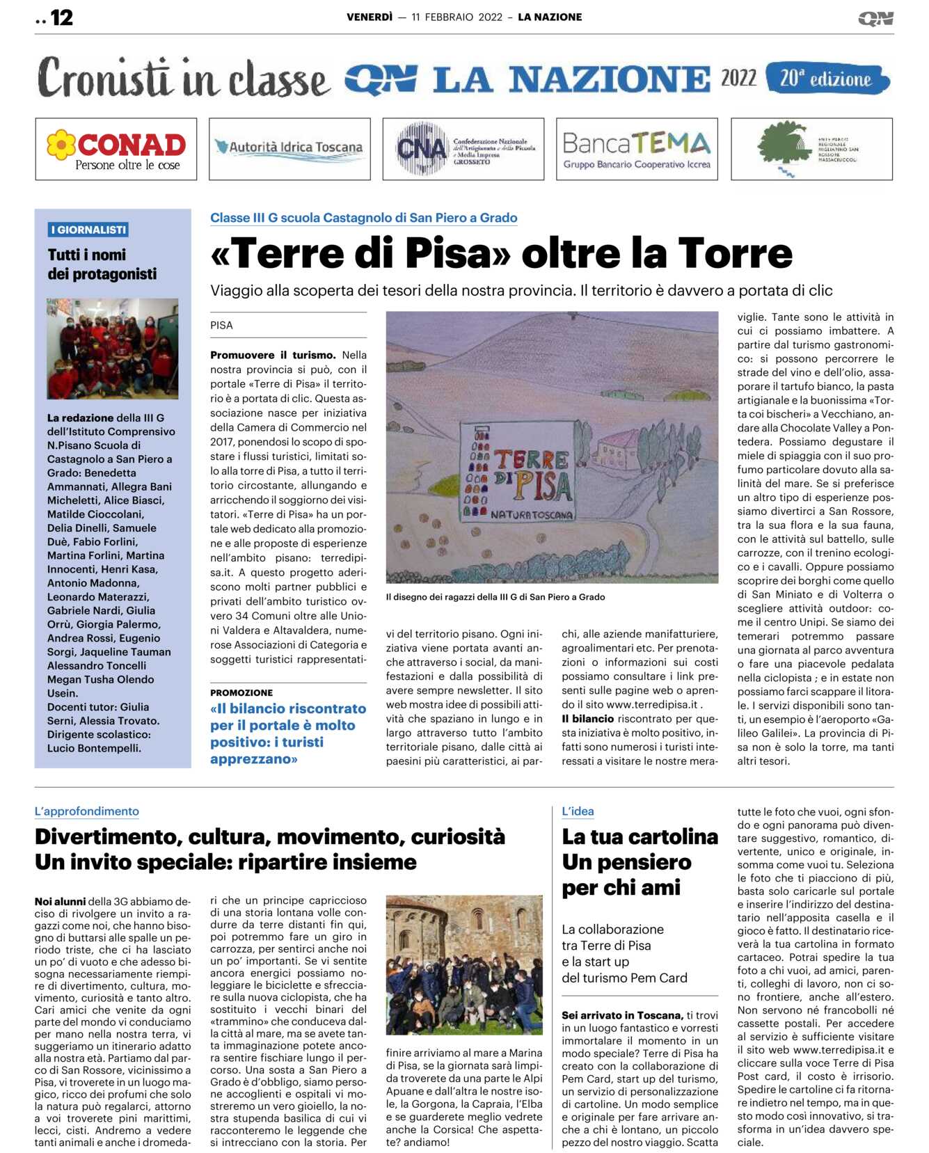 Promuovere il turismo. Nella nostra provincia si può, con il portale «Terre di Pisa» il territorio è a portata di clic. Questa associazione nasce per iniziativa della Camera di Commercio nel 2017, ponendosi lo scopo di spostare i flussi turistici, limitati solo alla torre di Pisa, a tutto il territorio circostante, allungando e arricchendo il soggiorno dei visitatori. «Terre di Pisa» ha un portale web dedicato alla promozione e alle proposte di esperienze nell’ambito pisano: terredipisa.it. A questo progetto aderiscono molti partner pubblici e privati dell’ambito turistico ovvero 34 Comuni oltre alle Unioni Valdera e Altavaldera, numerose Associazioni di Categoria e soggetti turistici rappresentati-vi del territorio pisano. Ogni iniziativa viene portata avanti anche attraverso i social, da manifestazioni e dalla possibilità di avere sempre newsletter. Il sito web mostra idee di possibili attività che spaziano in lungo e in largo attraverso tutto l’ambito territoriale pisano, dalle città ai paesini più caratteristici, ai par-chi, alle aziende manifatturiere, agroalimentari etc. Per prenotazioni o informazioni sui costi possiamo consultare i link presenti sulle pagine web o aprendo il sito www.terredipisa.it .
