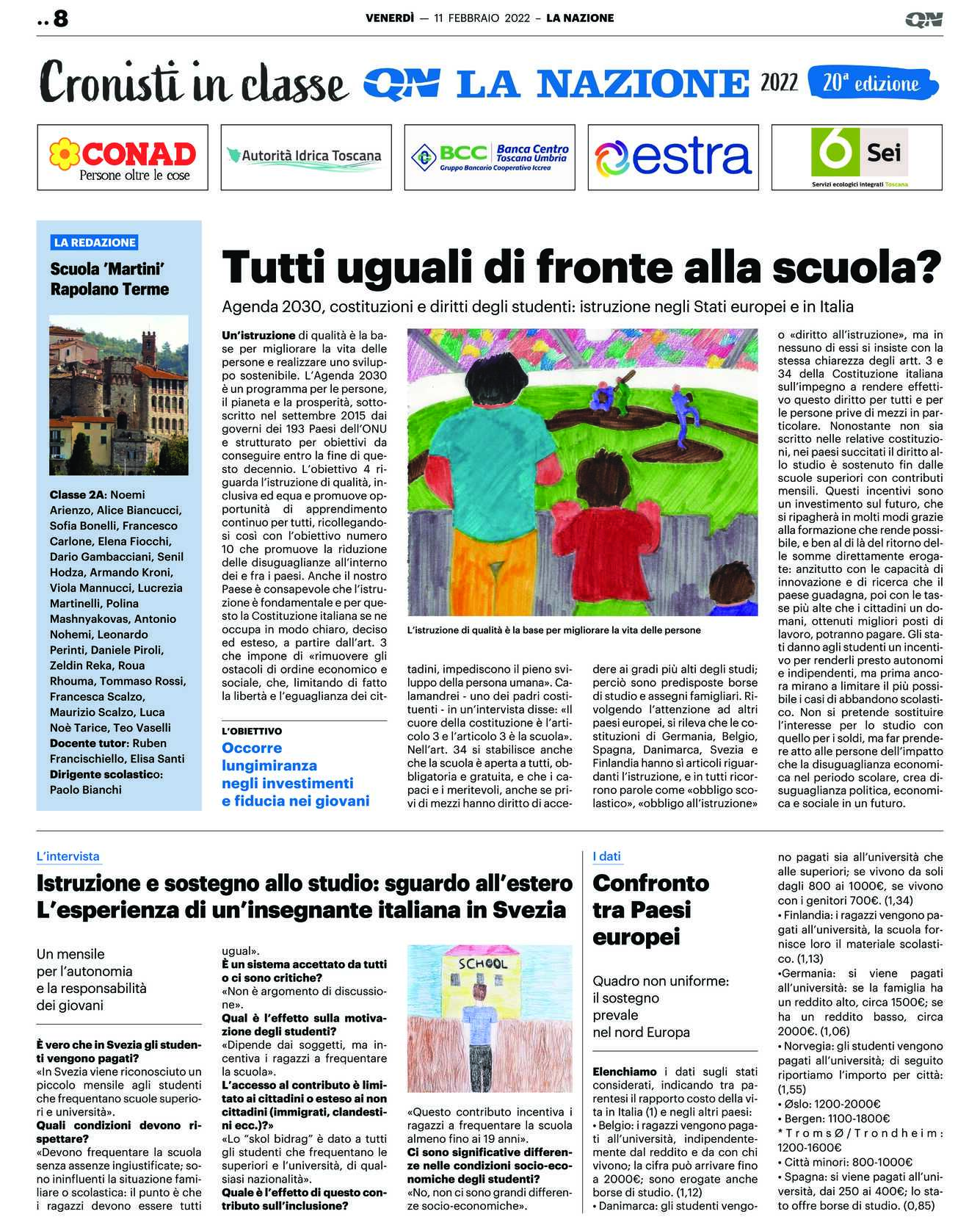 Un’istruzione di qualità è la base per migliorare la vita delle persone e realizzare uno sviluppo sostenibile. L’Agenda 2030 è un programma per le persone, il pianeta e la prosperità, sottoscritto nel settembre 2015 dai governi dei 193 Paesi dell’ONU e strutturato per obiettivi da conseguire entro la fine di questo decennio. L’obiettivo 4 riguarda l’istruzione di qualità, inclusiva ed equa e promuove opportunitàdiapprendimentocontinuo per tutti, ricollegandosi così con l’obiettivo numero 10 che promuove la riduzione delle disuguaglianze all’interno dei e fra i paesi. Anche il nostro Paese è consapevole che l’istruzione è fondamentale e per questo la Costituzione italiana se ne occupa in modo chiaro, deciso ed esteso, a partire dall’art. 3 che impone di «rimuovere gli ostacoli di ordine economico e sociale, che, limitando di fatto la libertà e l’eguaglianza dei cit-tadini, impediscono il pieno sviluppo della persona umana». Calamandrei – uno dei padri costituenti – in un’intervista disse: «Il cuore della costituzione è l’articolo 3 e l’articolo 3 è la scuola».