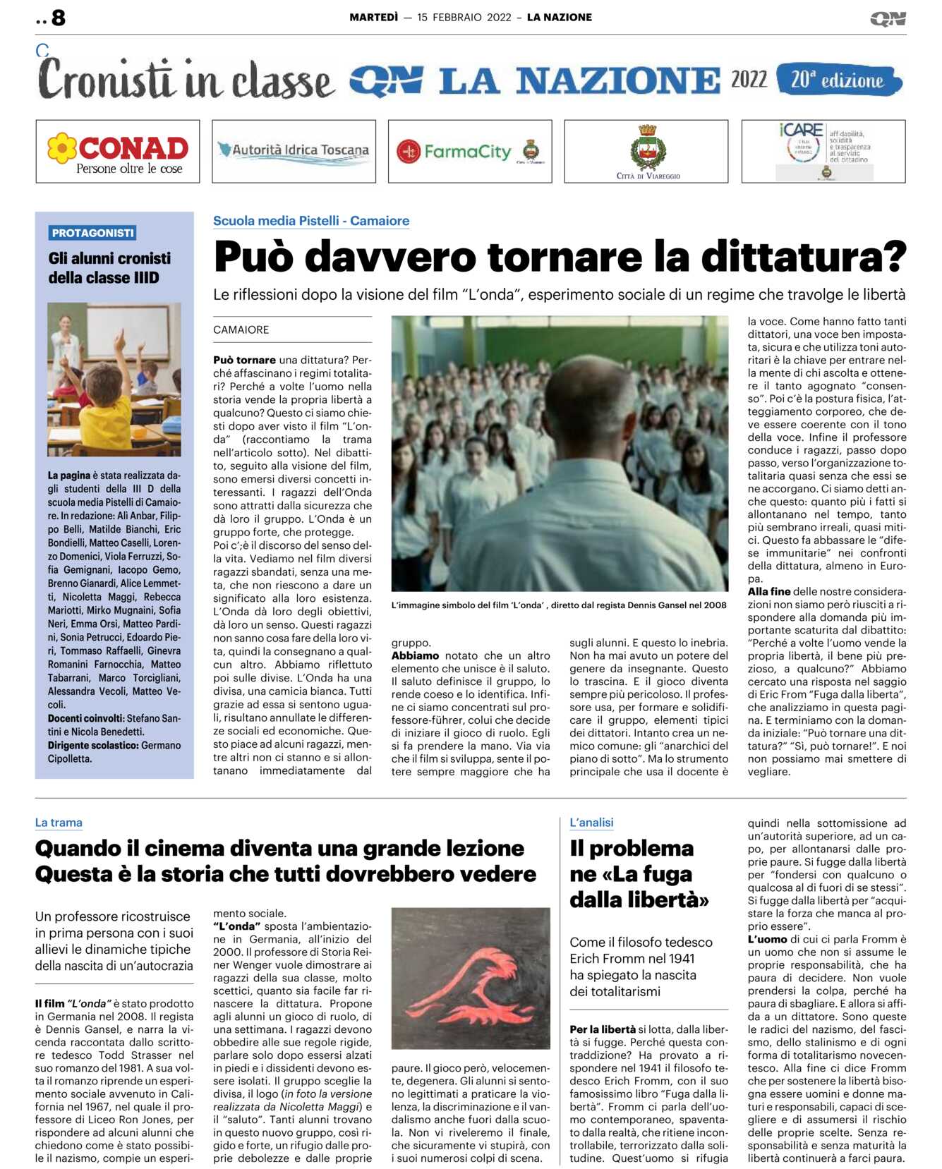 Può tornare una dittatura? Perché affascinano i regimi totalitari? Perché a volte l’uomo nella storia vende la propria libertà a qualcuno? Questo ci siamo chiesti dopo aver visto il film “L’onda”(raccontiamolatramanell’articolo sotto). Nel dibattito, seguito alla visione del film, sono emersi diversi concetti interessanti. I ragazzi dell’Onda sono attratti dalla sicurezza che dà loro il gruppo. L’Onda è un gruppo forte, che protegge.