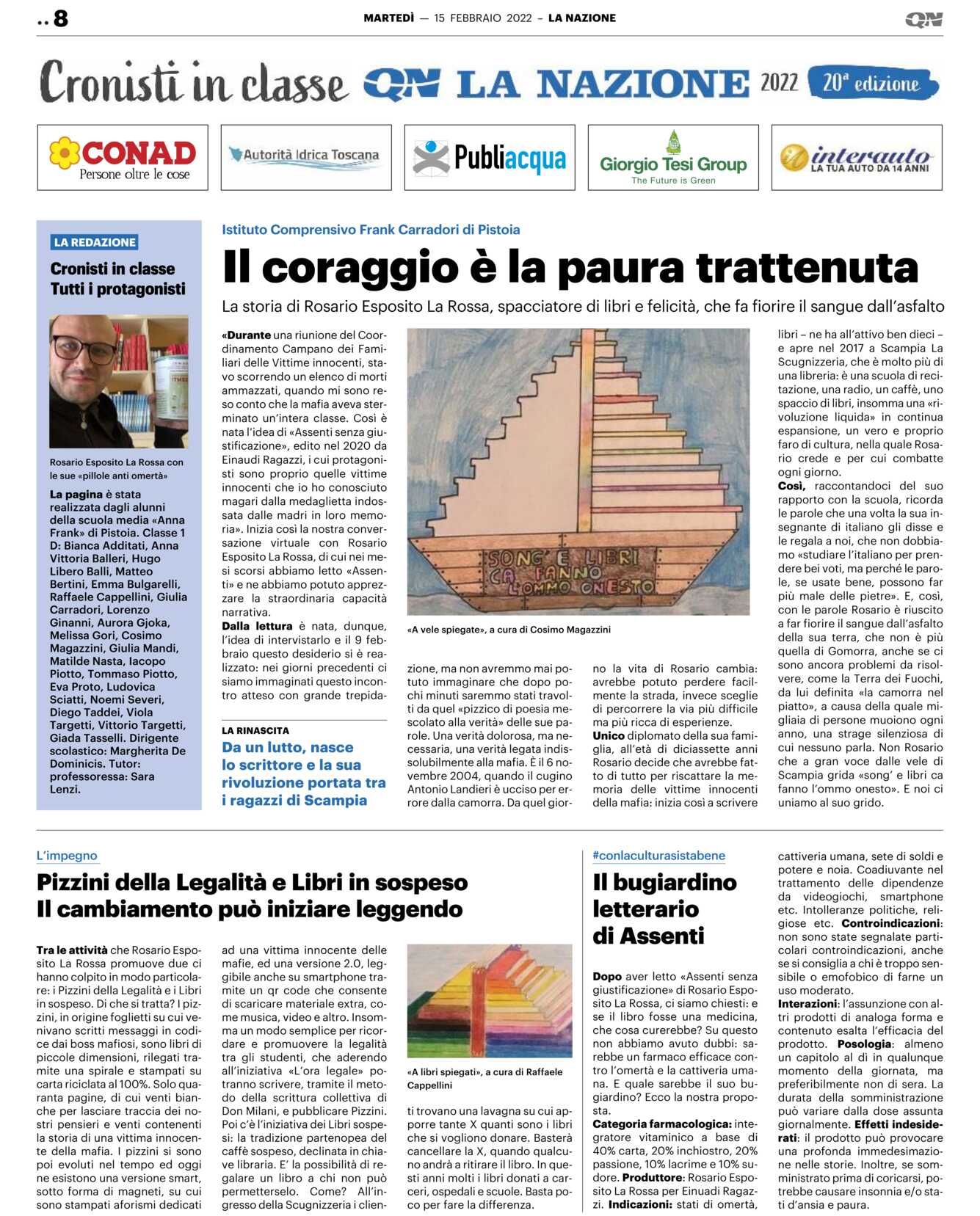 Tra le attività che Rosario Esposito La Rossa promuove due ci hanno colpito in modo particolare: i Pizzini della Legalità e i Libri in sospeso. Di che si tratta? I pizzini, in origine foglietti su cui venivano scritti messaggi in codice dai boss mafiosi, sono libri di piccole dimensioni, rilegati tramite una spirale e stampati su carta riciclata al 100%. Solo quaranta pagine, di cui venti bianche per lasciare traccia dei nostri pensieri e venti contenenti la storia di una vittima innocente della mafia. I pizzini si sono poi evoluti nel tempo ed oggi ne esistono una versione smart, sotto forma di magneti, su cui sono stampati aforismi dedicati ad una vittima innocente delle mafie, ed una versione 2.0, leggibile anche su smartphone tramite un qr code che consente di scaricare materiale extra, come musica, video e altro. Insomma un modo semplice per ricordare e promuovere la legalità tra gli studenti, che aderendo all’iniziativa «L’ora legale» potranno scrivere, tramite il metodo della scrittura collettiva di Don Milani, e pubblicare Pizzini.