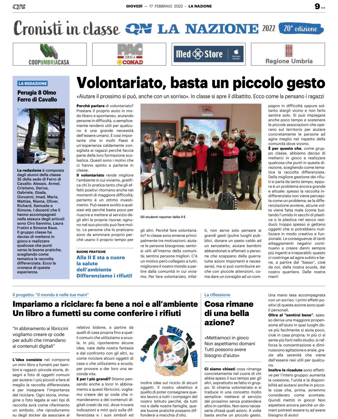 Il volontariato rende migliore l’ambiente in cui viviamo, gratifica chi lo pratica tanto che gli effetti positivi ritornano anche nei momenti di maggiore difficoltà; pertanto è un ottimo investimento. Può essere svolto a qualsiasi età perché basta poco per riuscire a mettere al servizio degli altri le proprie risorse: ognuno nel suo piccolo può fare molto. Le persone che lo praticano sono da ammirare proprio perché usano il proprio tempo pergli altri. Perché fare volontariato? In classe sono emerse principalmente tre motivazioni: aiutare le persone bisognose; sentirsi utili all’interno della comunità; sentirsi persone migliori. C’è un motivo però collegato a tutti: migliorare il nostro mondo a partire dalla comunità in cui viviamo. Per fare volontariato, infat-ti, non serve solo pensare ai grandi gesti (pulire luoghi pubblici, donare un pasto caldo ad un senzatetto, aiutare bambini abbandonati e affamati o persone che scappano dalla guerra: tutte azioni importanti e necessarie), ma si può contribuire anche con piccole attenzioni, come dare un consiglio ad un com-pagno in difficoltà oppure soltanto stargli vicino e non farlo sentire solo. Si può impiegare anche poco tempo e sostenere le piccole associazioni che operano sul territorio per aiutare concretamente le persone ad agire meglio nel rispetto della comunità dove vivono.