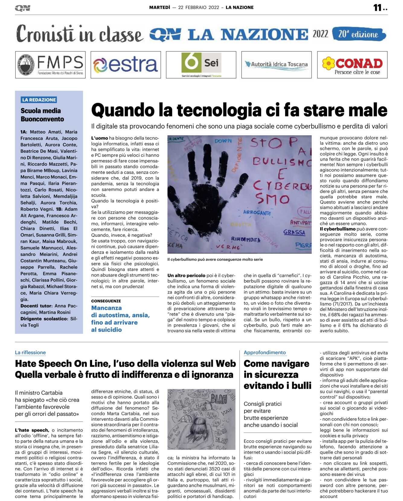 Quindi bisogna stare attenti e non abusare degli strumenti tecnologici; in altre parole, internet sì, ma con prudenza! Un altro pericolo poi è il cyberbullismo, un fenomeno sociale che indica una forma di violenza agita da una o più persone nei confronti di altre, considerate più deboli; un atteggiamento di prevaricazione attraverso la “rete” che è divenuto una “piaga” del nostro tempo e colpisce in prevalenza i giovani, che si trovano sia nella veste di vittima che in quella di “carnefici”. I cyberbulli possono rovinare la reputazione digitale di qualcuno in un attimo: basta inviare su un gruppo whatsapp anche ristretto, un video o foto che diventano virali in brevissimo tempo o maltrattarlo verbalmente sui social. Se un bullo, rispetto a un cyberbullo, può farti male anche fisicamente, entrambi comunque provocano dolore nella vittima: anche da dietro uno schermo, con le parole, si può colpire chi legge. Ogni insulto è una ferita che non guarirà facilmente! Non sempre i cyberbulli agiscono intenzionalmente; tutti noi possiamo assumere questo ruolo quando diffondiamo notizie su una persona per far ridere gli altri, senza pensare che quella potrebbe stare male.