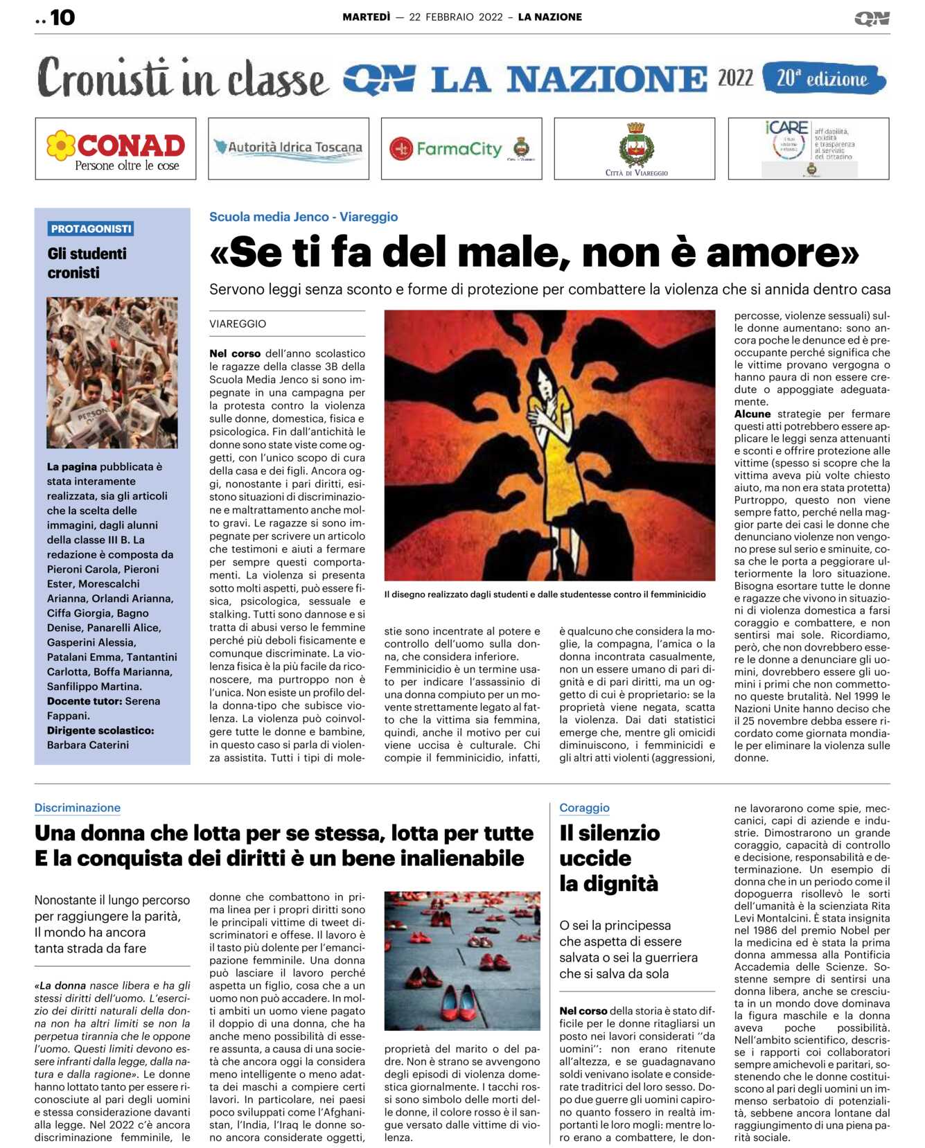 VIAREGGIO Nel corso dell’anno scolastico le ragazze della classe 3B della Scuola Media Jenco si sono impegnate in una campagna per la protesta contro la violenza sulle donne, domestica, fisica e psicologica. Fin dall’antichità le donne sono state viste come oggetti, con l’unico scopo di cura della casa e dei figli. Ancora oggi, nonostante i pari diritti, esistono situazioni di discriminazione e maltrattamento anche molto gravi. Le ragazze si sono impegnate per scrivere un articolo che testimoni e aiuti a fermare per sempre questi comportamenti. La violenza si presenta sotto molti aspetti, può essere fisica, psicologica, sessuale e stalking. Tutti sono dannose e si tratta di abusi verso le femmine perché più deboli fisicamente e comunque discriminate. La violenza fisica è la più facile da riconoscere, ma purtroppo non è l’unica. Non esiste un profilo della donna-tipo che subisce violenza. La violenza può coinvolgere tutte le donne e bambine, in questo caso si parla di violenza assistita. Tutti i tipi di mole-stie sono incentrate al potere e controllo dell’uomo sulla donna, che considera inferiore.