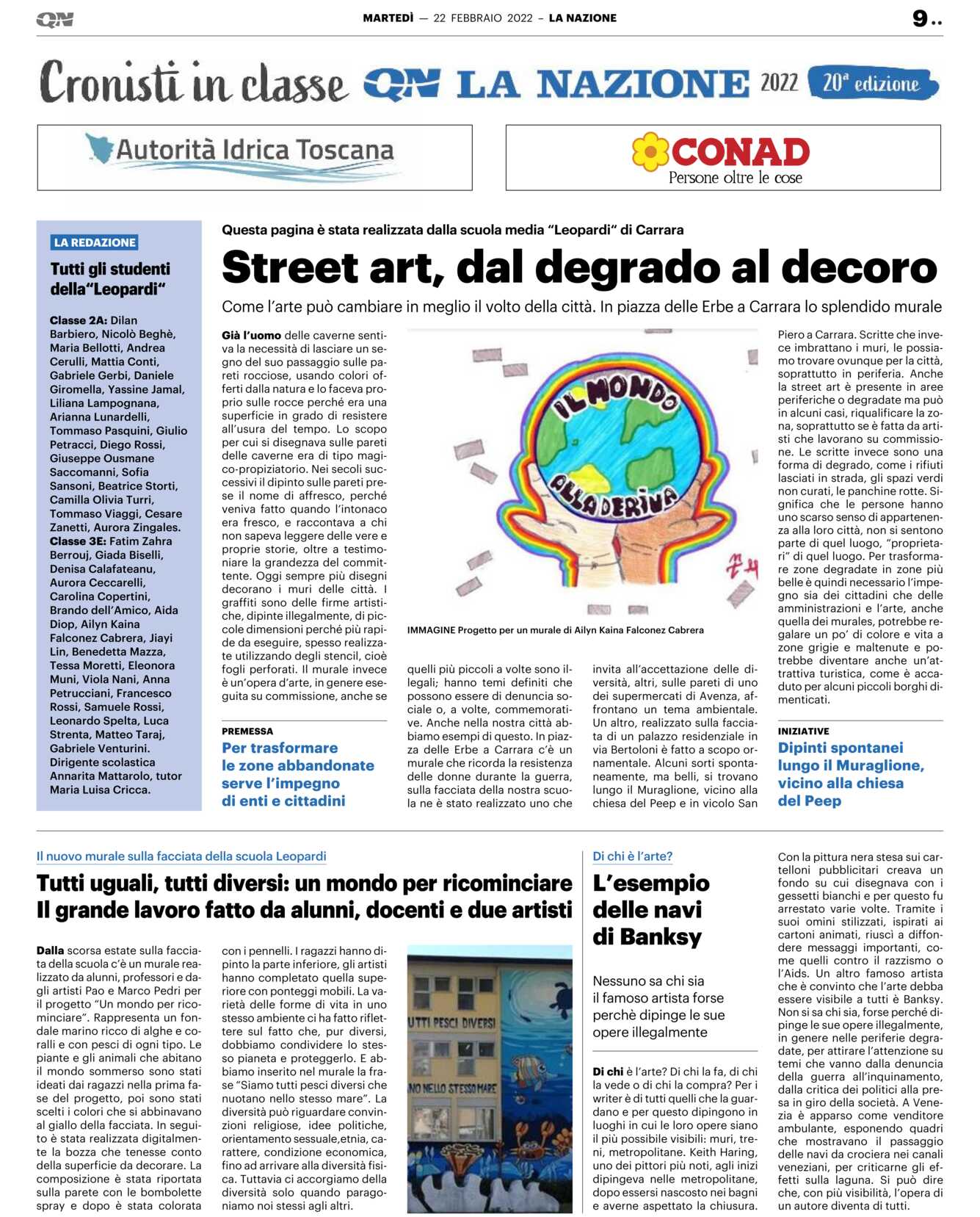 Già l’uomo delle caverne sentiva la necessità di lasciare un segno del suo passaggio sulle pareti rocciose, usando colori offerti dalla natura e lo faceva proprio sulle rocce perché era una superficie in grado di resistere all’usura del tempo. Lo scopo per cui si disegnava sulle pareti delle caverne era di tipo magico-propiziatorio. Nei secoli successivi il dipinto sulle pareti prese il nome di affresco, perché veniva fatto quando l’intonaco era fresco, e raccontava a chi non sapeva leggere delle vere e proprie storie, oltre a testimoniare la grandezza del committente. Oggi sempre più disegni decorano i muri delle città. I graffiti sono delle firme artistiche, dipinte illegalmente, di piccole dimensioni perché più rapide da eseguire, spesso realizzate utilizzando degli stencil, cioè fogli perforati. Il murale invece è un’opera d’arte, in genere eseguita su commissione, anche se quelli più piccoli a volte sono illegali; hanno temi definiti che possono essere di denuncia sociale o, a volte, commemorative. Anche nella nostra città abbiamo esempi di questo. In piazza delle Erbe a Carrara c’è un murale che ricorda la resistenza delle donne durante la guerra, sulla facciata della nostra scuola ne è stato realizzato uno che invita all’accettazione delle diversità, altri, sulle pareti di uno dei supermercati di Avenza, affrontano un tema ambientale.