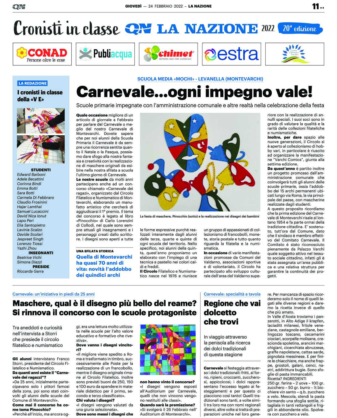 Quale occasione migliore di un articolo di giornale a Febbraio per parlare del Carnevale o meglio del nostro Carnevale di Montevarchi. Dovete sapere che per noi alunni della Scuola Primaria il Carnevale è da sempre una ricorrenza sentita quanto il Natale o la Pasqua, possiamo dare sfogo alla nostra fantasia e creatività con la realizzazione di maschere originali da esibire nella nostra sfilata a scuola l’ultimo giorno di Carnevale.