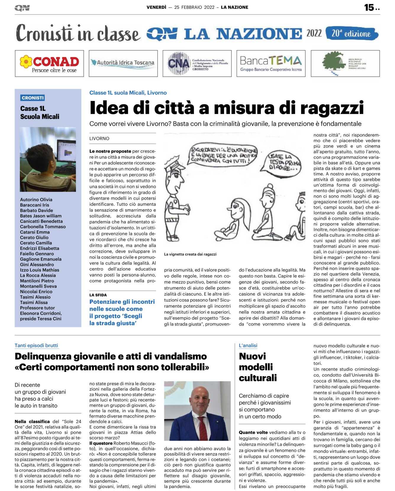 LIVORNO Le nostre proposte per crescere in una città a misura dei giovani Per un adolescente riconoscere e accettare un mondo di regole può apparire un percorso difficile e faticoso, soprattutto in una società in cui non si vedono figure di riferimento in grado di diventare modelli in cui potersi identificare. Tutto ciò aumenta la sensazione di smarrimento e solitudine, accresciuta dalla pandemia che ha alimentato situazioni d’isolamento. In un’ottica di prevenzione la scuola deve ricordarci che chi cresce ha diritto all’errore, ma anche alla correzione, deve sviluppare in noi la coscienza civile e promuovere la cultura della legalità. Al centro dell’azione educativa vanno posti la persona-alunno, come protagonista nella pro-pria comunità, ed il valore positivo delle regole, intese non come mezzo punitivo, bensì come strumento di aiuto delle potenzialità di ciascuno. E le altre istituzioni cosa possono fare? Sicuramente potenziare gli incontri negli istituti inferiori e superiori, sull’esempio del progetto “Scegli la strada giusta”, promuovendo l’educazione alla legalità. Ma questo non basta. Capire le esigenze dei giovani, secondo fasce d’età, costituirebbe un’occasione di vicinanza tra adolescenti e istituzioni: perché non moltiplicare gli spazio d’ascolto nella nostra amata cittadina e aprire dei dibattiti? Alla domanda “come vorremmo vivere la nostra città”, noi risponderemmo che ci piacerebbe vedere più zone verdi e un cinema all’aperto gratuito, tutto l’anno, con una programmazione variabile in base all’età. Oppure una pista da skate o di kart e games time. A nostro avviso, proporre attività di questo tipo sarebbe un’ottima forma di coinvolgimento dei giovani. Oggi, infatti, non ci sono molti luoghi di aggregazione (centri sportivi, oratori, campi scuola, bar) che allontanano dalla cattiva strada, quindi è compito delle istituzioni proporre valide alternative.