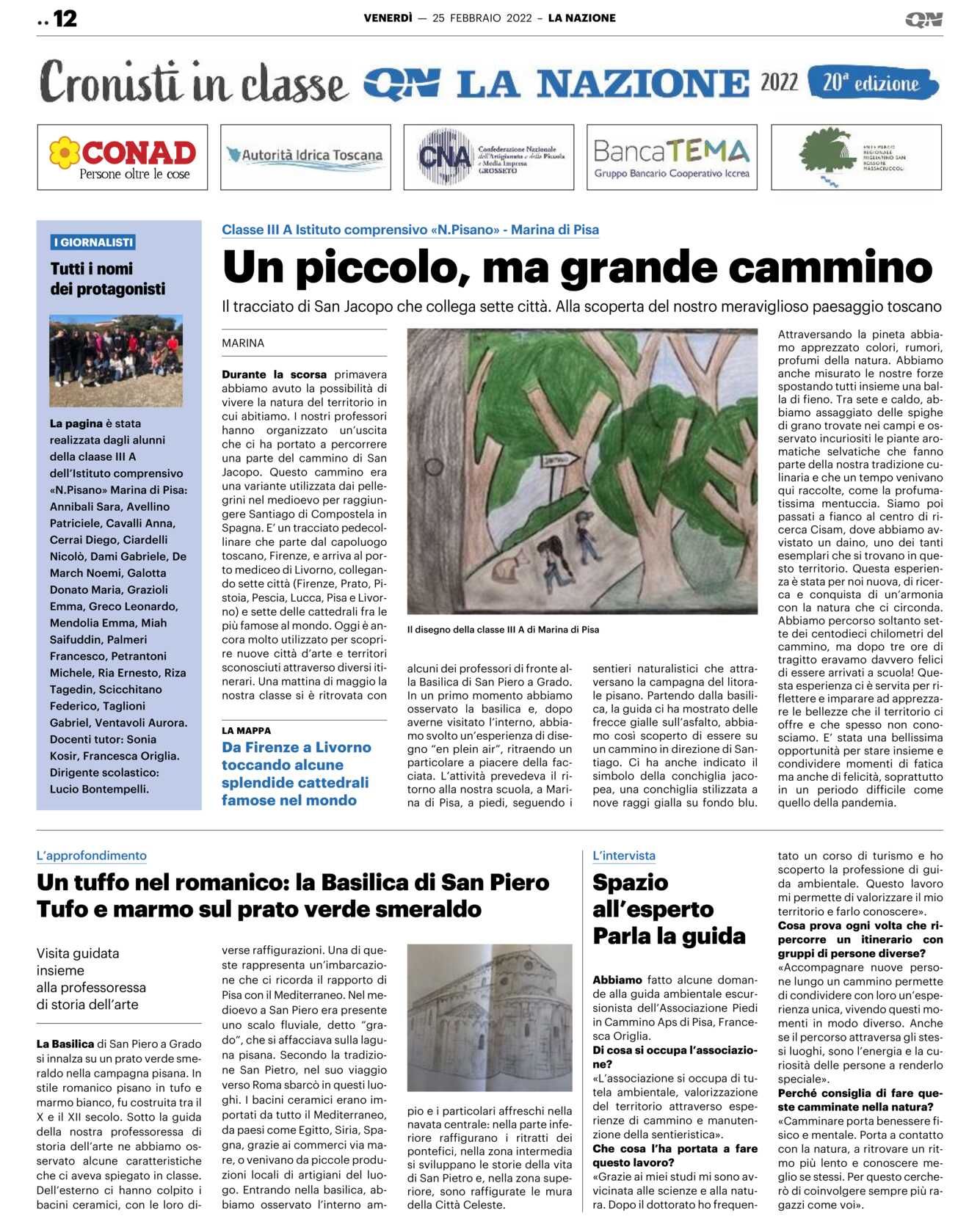 MARINA Durante la scorsa primavera abbiamo avuto la possibilità di vivere la natura del territorio in cui abitiamo. I nostri professori hanno organizzato un’uscita che ci ha portato a percorrere una parte del cammino di San Jacopo. Questo cammino era una variante utilizzata dai pellegrini nel medioevo per raggiungere Santiago di Compostela in Spagna. E’ un tracciato pedecollinare che parte dal capoluogo toscano, Firenze, e arriva al porto mediceo di Livorno, collegando sette città (Firenze, Prato, Pistoia, Pescia, Lucca, Pisa e Livorno) e sette delle cattedrali fra le più famose al mondo. Oggi è ancora molto utilizzato per scoprire nuove città d’arte e territori sconosciuti attraverso diversi itinerari. Una mattina di maggio la nostra classe si è ritrovata con alcuni dei professori di fronte alla Basilica di San Piero a Grado.