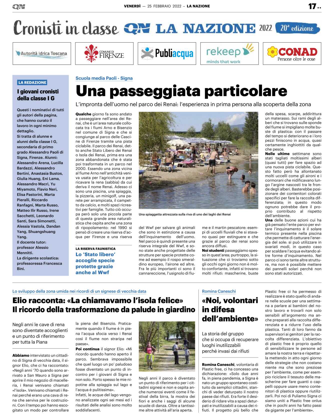 Qualche giorno fa sono andato a passeggiare nell’area dei Renai, che è un’area naturale collocata tra i fiumi Arno e Bisenzio nel comune di Signa e che si congiunge al parco delle Cascine di Firenze tramite una pista ciclabile. Il parco dei Renai, detto anche Stato Libero dei Renai o Isola dei Renai, prima era una zona abbandonata che è stata poi trasformata in un parco nel 2000. Essendo una zona vicina al fiume Arno nell’antichità veniva usata per l’agricoltura e per ricavare la rena (sabbia) da cui deriva il nome Renai. Adesso ci sono una piscina, una spiaggia, la pizzeria, un minigolf, una parete per arrampicata, il campetto da calcio, e molti spazi ricreativi per famiglie. Tutto ciò occupa però solo una piccola parte di questa grande area naturalistica che ospita anche una zona di ripopolamento: nel 1990 si pensò di creare una riserva d’acqua per Firenze e una riserva del Wwf per salvare gli animali che sono in estinzione a causa dell’inquinamento dell’uomo. Nel parco è quindi presente una riserva integrale del Wwf, e sono state anche progettate delle strutture per specie protette come ad esempio il rospo smeraldino europeo, l’airone ed altre.