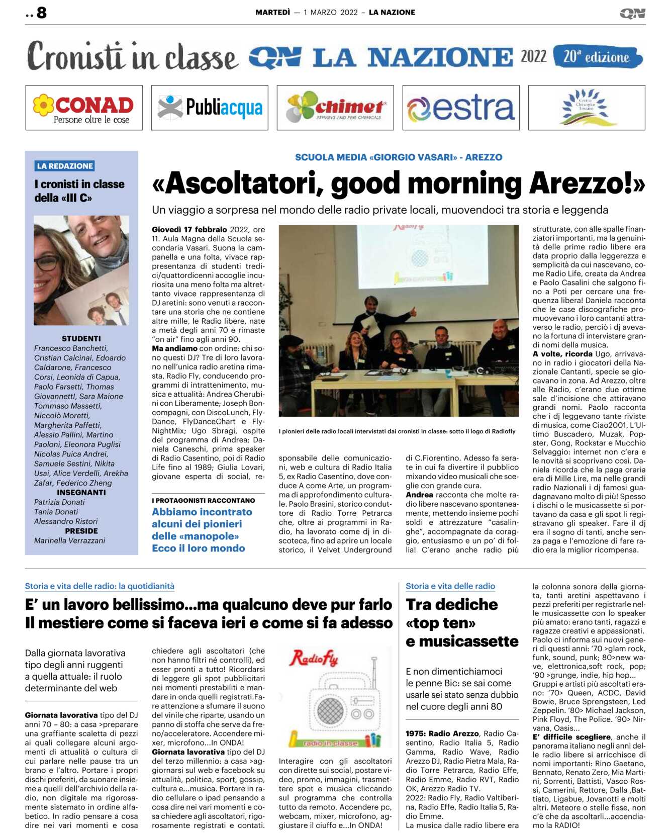 Giovedì 17 febbraio 2022, ore 11. Aula Magna della Scuola secondaria Vasari. Suona la campanella e una folta, vivace rappresentanza di studenti tredici/quattordicenni accoglie incuriosita una meno folta ma altrettanto vivace rappresentanza di DJ aretini: sono venuti a raccontare una storia che ne contiene altre mille, le Radio libere, nate a metà degli anni 70 e rimaste “on air” fino agli anni 90.
