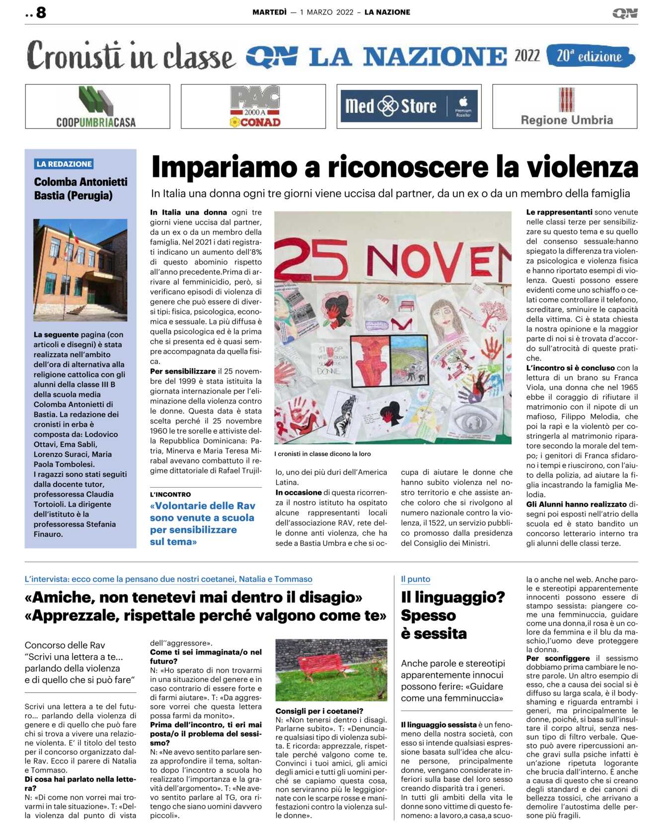 In occasione di questa ricorrenza il nostro istituto ha ospitato alcune rappresentanti locali dell’associazione RAV, rete delle donne anti violenza, che ha sede a Bastia Umbra e che si oc-cupa di aiutare le donne che hanno subito violenza nel nostro territorio e che assiste anche coloro che si rivolgono al numero nazionale contro la violenza, il 1522, un servizio pubblico promosso dalla presidenza del Consiglio dei Ministri. Le rappresentanti sono venute nelle classi terze per sensibilizzare su questo tema e su quello del consenso sessuale: hanno spiegato la differenza tra violenza psicologica e violenza fisica e hanno riportato esempi di violenza. Questi possono essere evidenti come uno schiaffo o celati come controllare il telefono, screditare, sminuire le capacità della vittima. Ci è stata chiesta la nostra opinione e la maggior parte di noi si è trovata d’accordo sull’atrocità di queste pratiche.