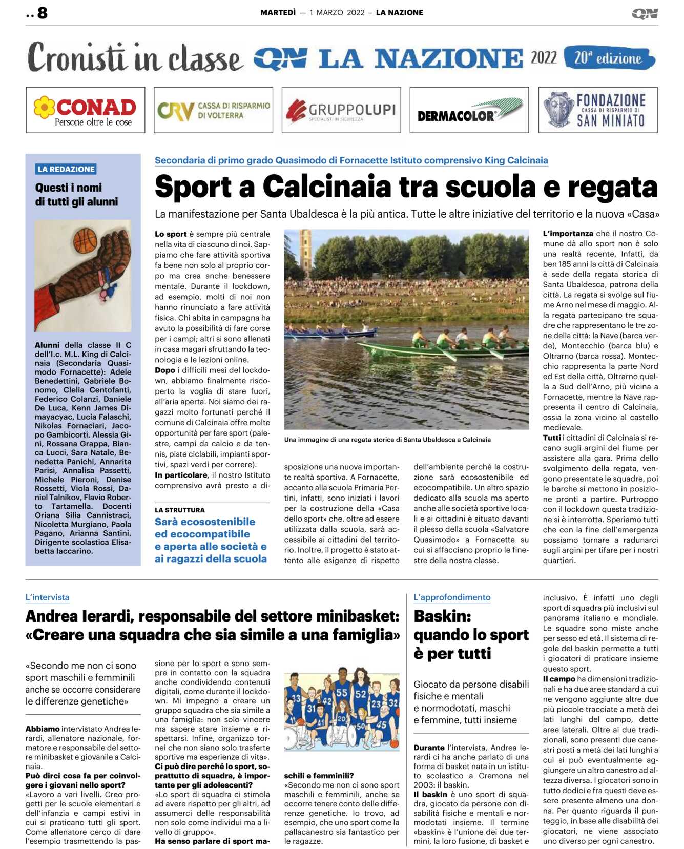 In particolare, il nostro Istituto comprensivo avrà presto a disposizione una nuova importante realtà sportiva. A Fornacette, accanto alla scuola Primaria Pertini, infatti, sono iniziati i lavori per la costruzione della «Casa dello sport» che, oltre ad essere utilizzata dalla scuola, sarà accessibile ai cittadini del territorio. Inoltre, il progetto è stato attento alle esigenze di rispetto dell’ambiente perché la costruzione sarà ecosostenibile ed ecocompatibile. Un altro spazio dedicato alla scuola ma aperto anche alle società sportive locali e ai cittadini è situato davanti il plesso della scuola «Salvatore Quasimodo» a Fornacette su cui si affacciano proprio le finestre della nostra classe. L’importanza che il nostro Comune dà allo sport non è solo una realtà recente. Infatti, da ben 185 anni la città di Calcinaia è sede della regata storica di Santa Ubaldesca, patrona della città. La regata si svolge sul fiume Arno nel mese di maggio. Alla regata partecipano tre squadre che rappresentano le tre zone della città: la Nave (barca verde), Montecchio (barca blu) e Oltrarno (barca rossa). Montecchio rappresenta la parte Nord ed Est della città, Oltrarno quella a Sud dell’Arno, più vicina a Fornacette, mentre la Nave rappresenta il centro di Calcinaia, ossia la zona vicino al castello medievale.