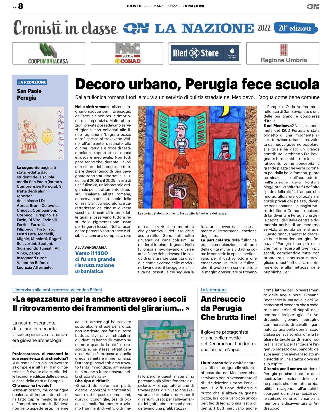 La particolarità della fullonica era la sua ubicazione al di fuori della cinta muraria cittadina come le concerie in epoca medioevale, per il cattivo odore che emanavano. In Italia le fulloniche ritrovate non sono molte e le meglio conservate si trovano a Pompei e Ostia Antica ma la fullonica di San Bevignate è una delle più grandi e complesse d’Italia! E nel Medioevo? Nella seconda metà del 1200 Perugia è stata oggetto di una imponente ristrutturazione urbanistica, voluta dal nuovo governo popolare, alla quale ha dato un grande contributo l’architetto Fra Bevignate: furono abbattute le case fatiscenti, venne concepita la grande piazza che verrà coronata poi dalla bella fontana, punto terminale dell’acquedotto; nell’iscrizione della Fontana Maggiore l’architetto fu definito “padre della città”. L’acqua, che fino ad allora era collocata nei cortili privati dei palazzi, divenne bene comune. Le magistrature del libero Comune decisero di far diventare Perugia una delle capitali dell’Italia centrale dotandola anche di un moderno servizio di pulizia delle strade.