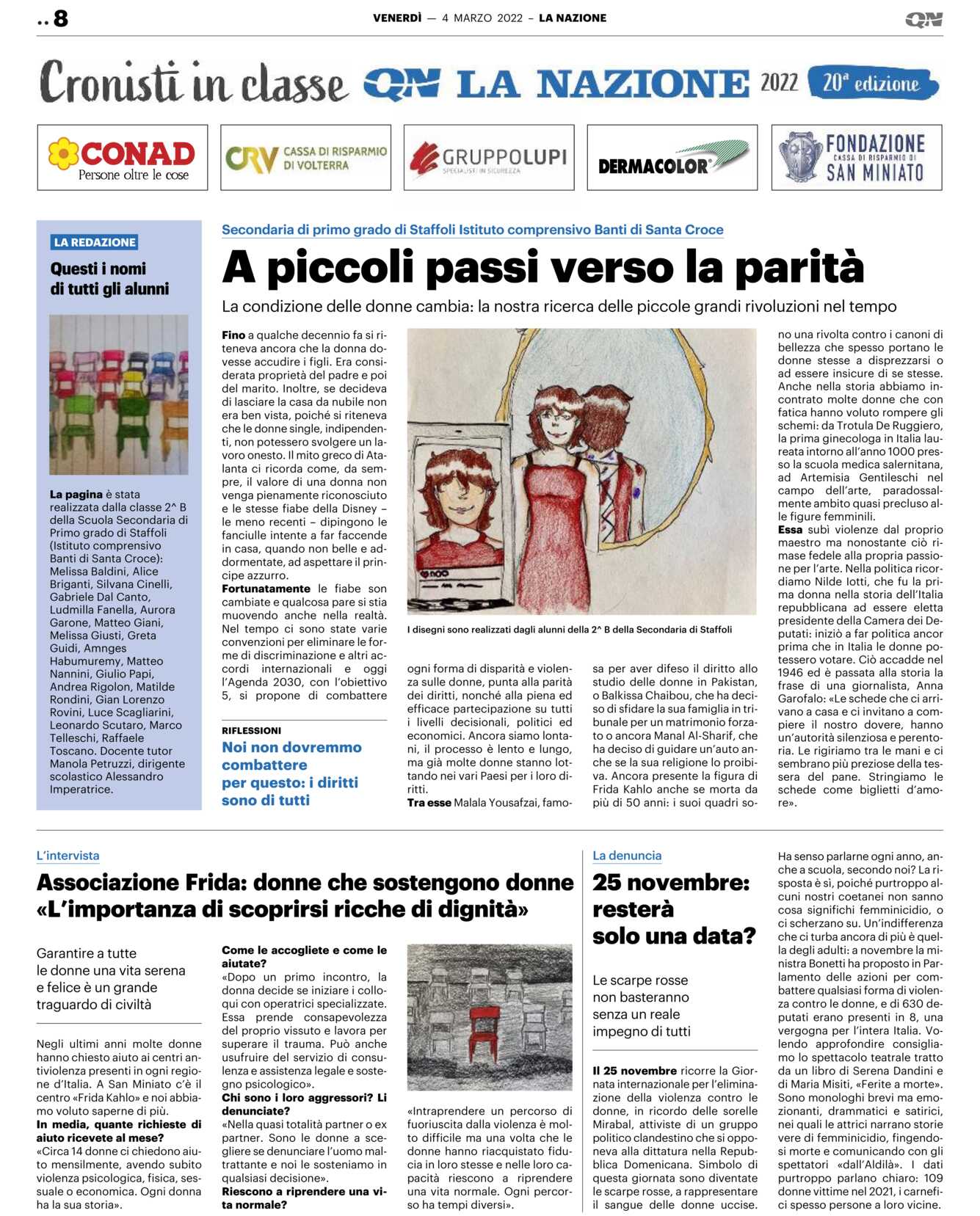 Tra esse Malala Yousafzai, famo-sa per aver difeso il diritto allo studio delle donne in Pakistan, o Balkissa Chaibou, che ha deciso di sfidare la sua famiglia in tribunale per un matrimonio forzato o ancora Manal Al-Sharif, che ha deciso di guidare un’auto anche se la sua religione lo proibiva. Ancora presente la figura di Frida Kahlo anche se morta da più di 50 anni: i suoi quadri so-no una rivolta contro i canoni di bellezza che spesso portano le donne stesse a disprezzarsi o ad essere insicure di se stesse.