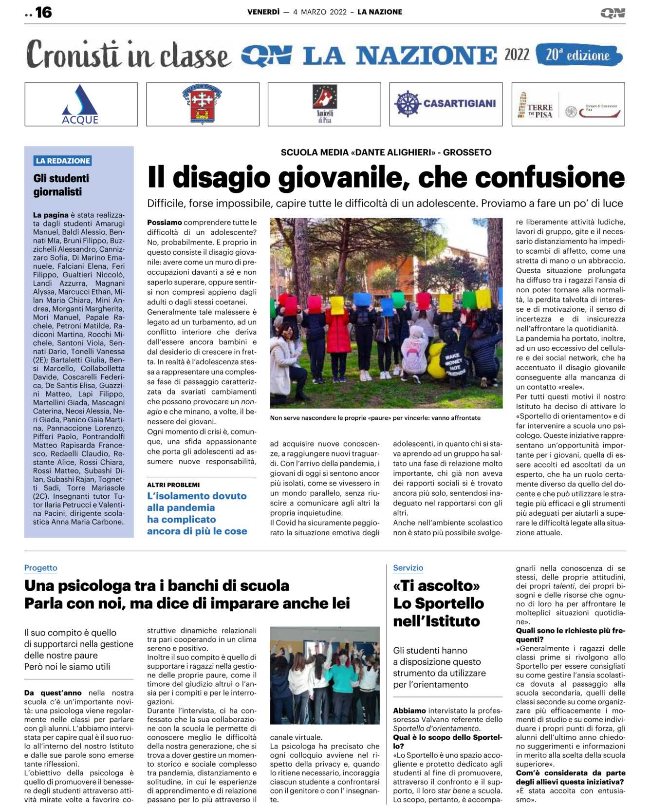 Per tutti questi motivi il nostro Istituto ha deciso di attivare lo «Sportello di orientamento» e di far intervenire a scuola uno psicologo. Queste iniziative rappresentano un’opportunità importante per i giovani, quella di essere accolti ed ascoltati da un esperto, che ha un ruolo certamente diverso da quello del docente e che può utilizzare le strategie più efficaci e gli strumenti più adeguati per aiutarli a superare le difficoltà legate alla situazione attuale.