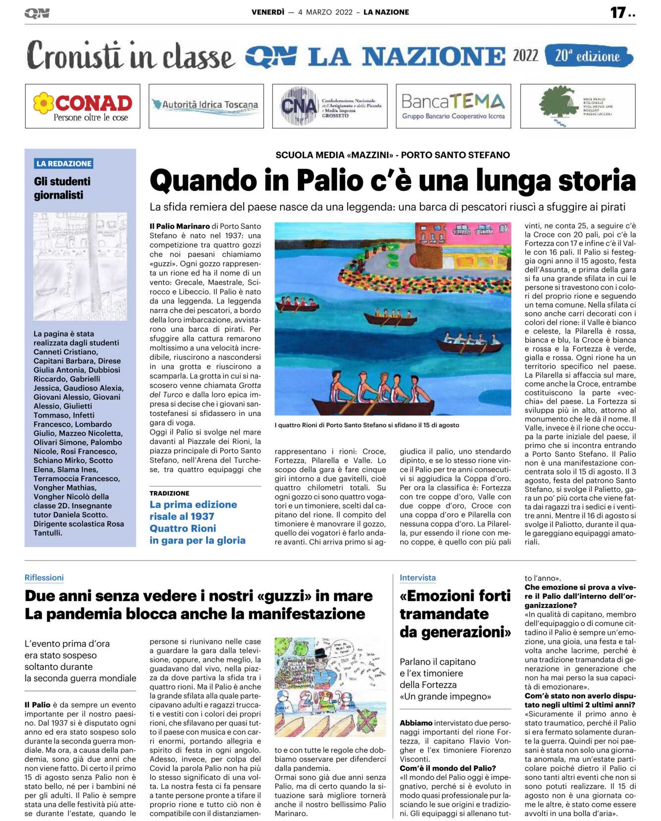Il Palio Marinaro di Porto Santo Stefano è nato nel 1937: una competizione tra quattro gozzi che noi paesani chiamiamo «guzzi». Ogni gozzo rappresenta un rione ed ha il nome di un vento: Grecale, Maestrale, Scirocco e Libeccio. Il Palio è nato da una leggenda. La leggenda narra che dei pescatori, a bordo della loro imbarcazione, avvistarono una barca di pirati. Per sfuggire alla cattura remarono moltissimo a una velocità incredibile, riuscirono a nascondersi in una grotta e riuscirono a scamparla. La grotta in cui si nascosero venne chiamata Grotta del Turco e dalla loro epica impresa si decise che i giovani santostefanesi si sfidassero in una gara di voga.