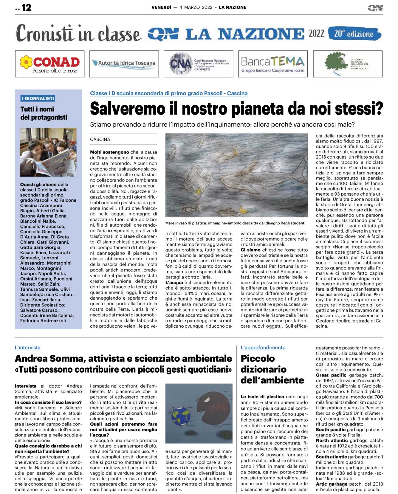 CASCINAMolti sostengono che, a causa dell’inquinamento, il nostro pianeta sta morendo. Alcuni non credono che la situazione sia così grave mentre altre realtà stanno collaborando con l’ambiente per offrire al pianeta una seconda possibilità. Noi, ragazze e ragazzi, vediamo tutti i giorni rifiuti abbandonati per strada da persone incivili, rifiuti che finiscono nelle acque, montagne di spazzatura fuori dalle abitazioni, file di automobili che rendono l’aria irrespirabile, prati verdi trasformati in distese di cemento. Ci siamo chiesti quanto i nostri comportamenti di tutti i giorni danneggiano il pianeta. In classe abbiamo studiato i miti della nascita del mondo: molti popoli, antichi e moderni, credevano che il pianeta fosse stato creato dall’unione dell’acqua con l’aria il fuoco e la terra; tutti questi elementi, oggi, li stiamo danneggiando e speriamo che questo non porti alla fine della nostra bella Terra. L’aria è minacciata dai motori di automobili e motorini e dalle fabbriche che producono veleni: le polve-ri sottili. Tutte le volte che teniamo il motore dell’auto acceso mentre siamo fermi aggraviamo questo problema, tutte le volte che teniamo le lampadine accese più del necessario o i termosifoni più caldi di quanto dovremmo, siamo corresponsabili della battaglia contro l’aria.