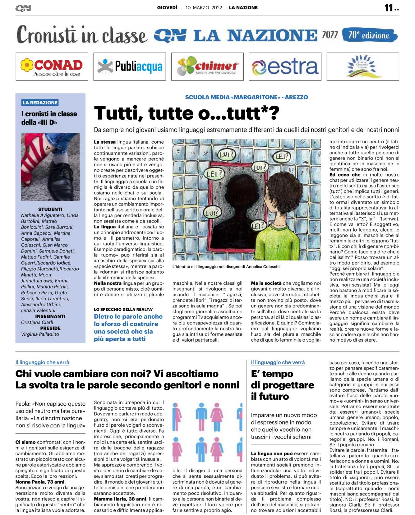 Nella nostra lingua per un gruppo di persone misto, cioè uomini e donne si utilizza il plurale maschile. Nelle nostre classi gli insegnanti si rivolgono a noi usando il maschile: “ragazzi, prendete i libri”, “i ragazzi di terza sono in aula magna” . Se poi sfogliamo giornali o ascoltiamo programmi Tv acquisiamo ancora più consapevolezza di quanto profondamente la nostra lingua sia intrisa di forme sessiste e di valori patriarcali. Ma la società che vogliamo noi giovani è molto diversa, è à inclusiva, dove stereotipi, etichette non trovino più posto, dove un genere non sia predominante sull’altro, dove centrale sia la persona, al di là di qualsiasi classificazione. E quindi? Cominciamo dal linguaggio: vogliamo l’uso sia del plurale maschile che di quello femminile o vogliamo introdurre un neutro (il latino ci indica la via) per rivolgerci anche a tutte quelle persone di genere non binario (chi non si identifica né in maschio né in femmina) che sono fra noi.