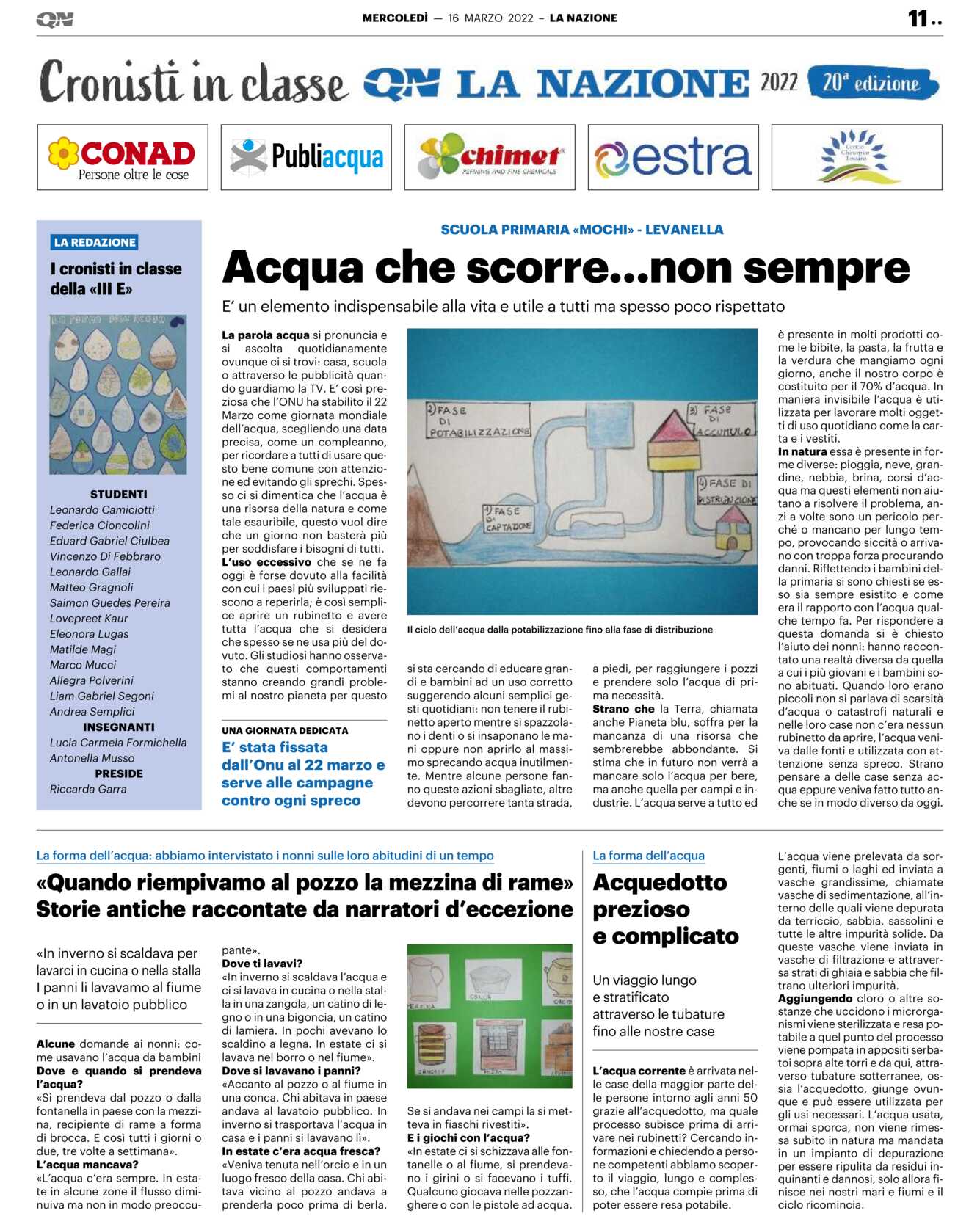 In natura essa è presente in forme diverse: pioggia, neve, grandine, nebbia, brina, corsi d’acqua ma questi elementi non aiutano a risolvere il problema, anzi a volte sono un pericolo perché o mancano per lungo tempo, provocando siccità o arrivano con troppa forza procurando danni. Riflettendo i bambini della primaria si sono chiesti se esso sia sempre esistito e come era il rapporto con l’acqua qualche tempo fa. Per rispondere a questa domanda si è chiesto l’aiuto dei nonni: hanno raccontato una realtà diversa da quella a cui i più giovani e i bambini sono abituati. Quando loro erano piccoli non si parlava di scarsità d’acqua o catastrofi naturali e nelle loro case non c’era nessun rubinetto da aprire, l’acqua veniva dalle fonti e utilizzata con attenzione senza spreco. Strano pensare a delle case senza acqua eppure veniva fatto tutto anche se in modo diverso da oggi.