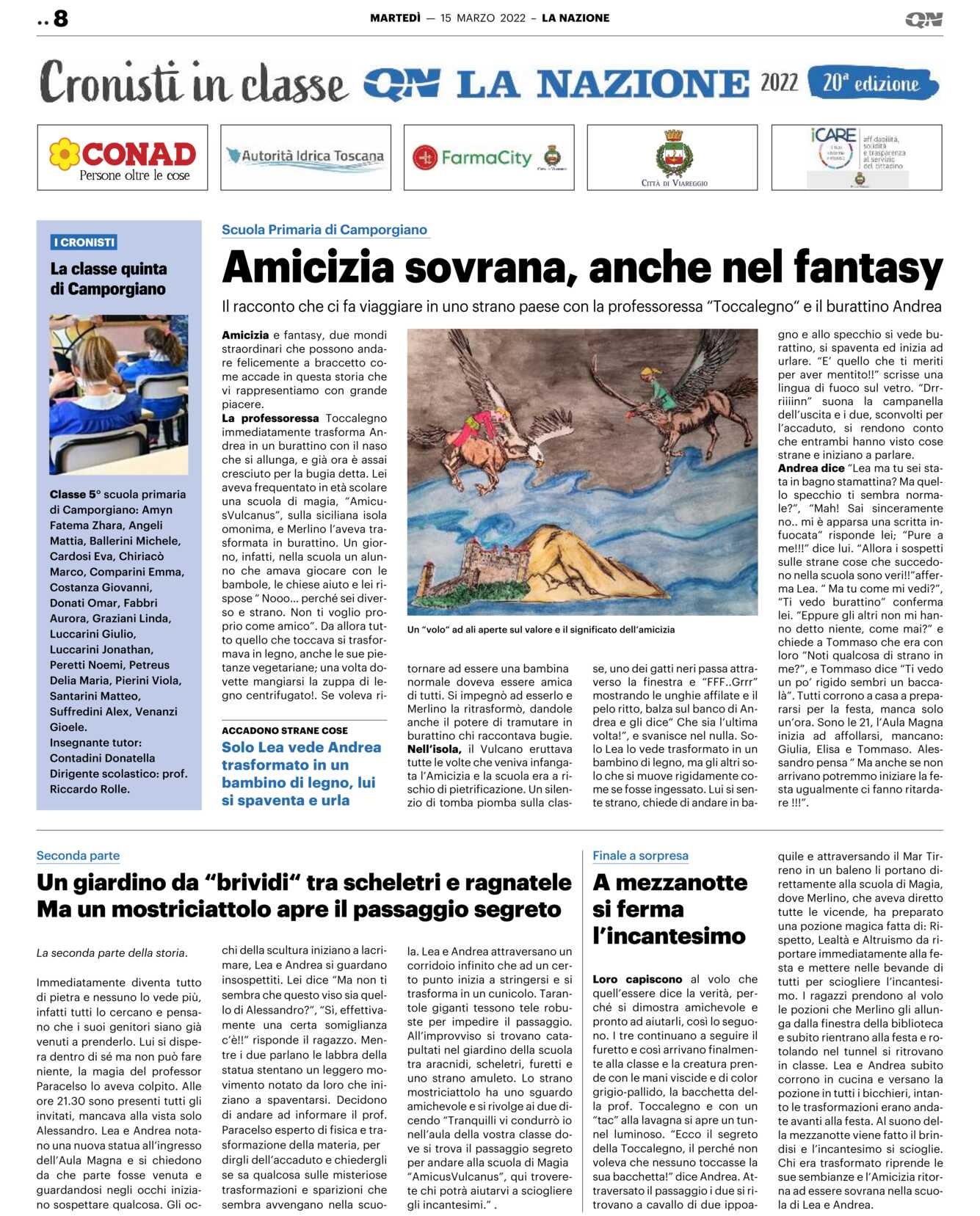 Nell’isola, il Vulcano eruttava tutte le volte che veniva infangata l’Amicizia e la scuola era a rischio di pietrificazione. Un silenzio di tomba piomba sulla classe, uno dei gatti neri passa attraverso la finestra e “FFF..Grrr” mostrando le unghie affilate e il pelo ritto, balza sul banco di Andrea e gli dice“ Che sia l’ultima volta!”, e svanisce nel nulla. Solo Lea lo vede trasformato in un bambino di legno, ma gli altri solo che si muove rigidamente come se fosse ingessato. Lui si sente strano, chiede di andare in bagno e allo specchio si vede burattino, si spaventa ed inizia ad urlare. “E’ quello che ti meriti per aver mentito!!” scrisse una lingua di fuoco sul vetro. “Drrriiiinn” suona la campanella dell’uscita e i due, sconvolti per l’accaduto, si rendono conto che entrambi hanno visto cose strane e iniziano a parlare.