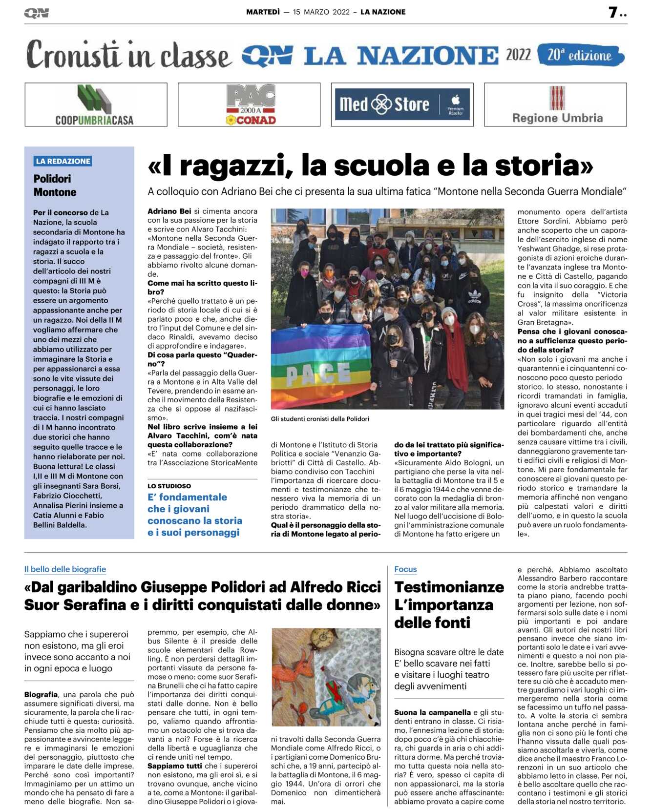 Pensa che i giovani conoscano a sufficienza questo periodo della storia? «Non solo i giovani ma anche i quarantenni e i cinquantenni conoscono poco questo periodo storico. Io stesso, nonostante i ricordi tramandati in famiglia, ignoravo alcuni eventi accaduti in quei tragici mesi del ’44, con particolare riguardo all’entità dei bombardamenti che, anche senza causare vittime tra i civili, danneggiarono gravemente tanti edifici civili e religiosi di Montone. Mi pare fondamentale far conoscere ai giovani questo periodo storico e tramandare la memoria affinché non vengano più calpestati valori e diritti dell’uomo, e in questo la scuola può avere un ruolo fondamentale».