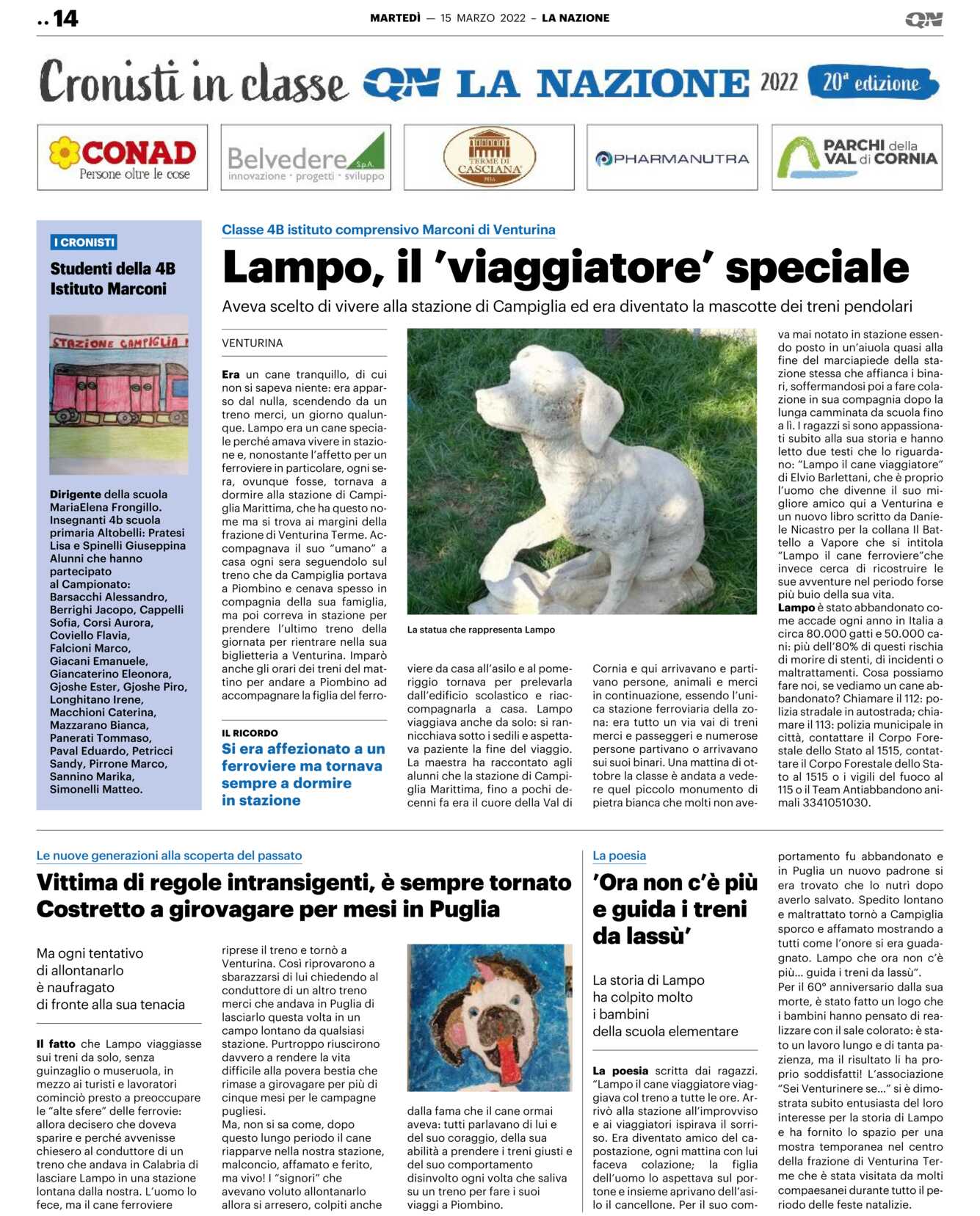 La maestra ha raccontato agli alunni che la stazione di Campiglia Marittima, fino a pochi decenni fa era il cuore della Val di Cornia e qui arrivavano e partivano persone, animali e merci in continuazione, essendo l’unica stazione ferroviaria della zona: era tutto un via vai di treni merci e passeggeri e numerose persone partivano o arrivavano sui suoi binari. Una mattina di ottobre la classe è andata a vedere quel piccolo monumento di pietra bianca che molti non aveva mai notato in stazione essendo posto in un’aiuola quasi alla fine del marciapiede della stazione stessa che affianca i binari, soffermandosi poi a fare colazione in sua compagnia dopo la lunga camminata da scuola fino a lì. I ragazzi si sono appassionati subito alla sua storia e hanno letto due testi che lo riguardano: “Lampo il cane viaggiatore” di Elvio Barlettani, che è proprio l’uomo che divenne il suo migliore amico qui a Venturina e un nuovo libro scritto da Daniele Nicastro per la collana Il Battello a Vapore che si intitola “Lampo il cane ferroviere” che invece cerca di ricostruire le sue avventure nel periodo forse più buio della sua vita.
