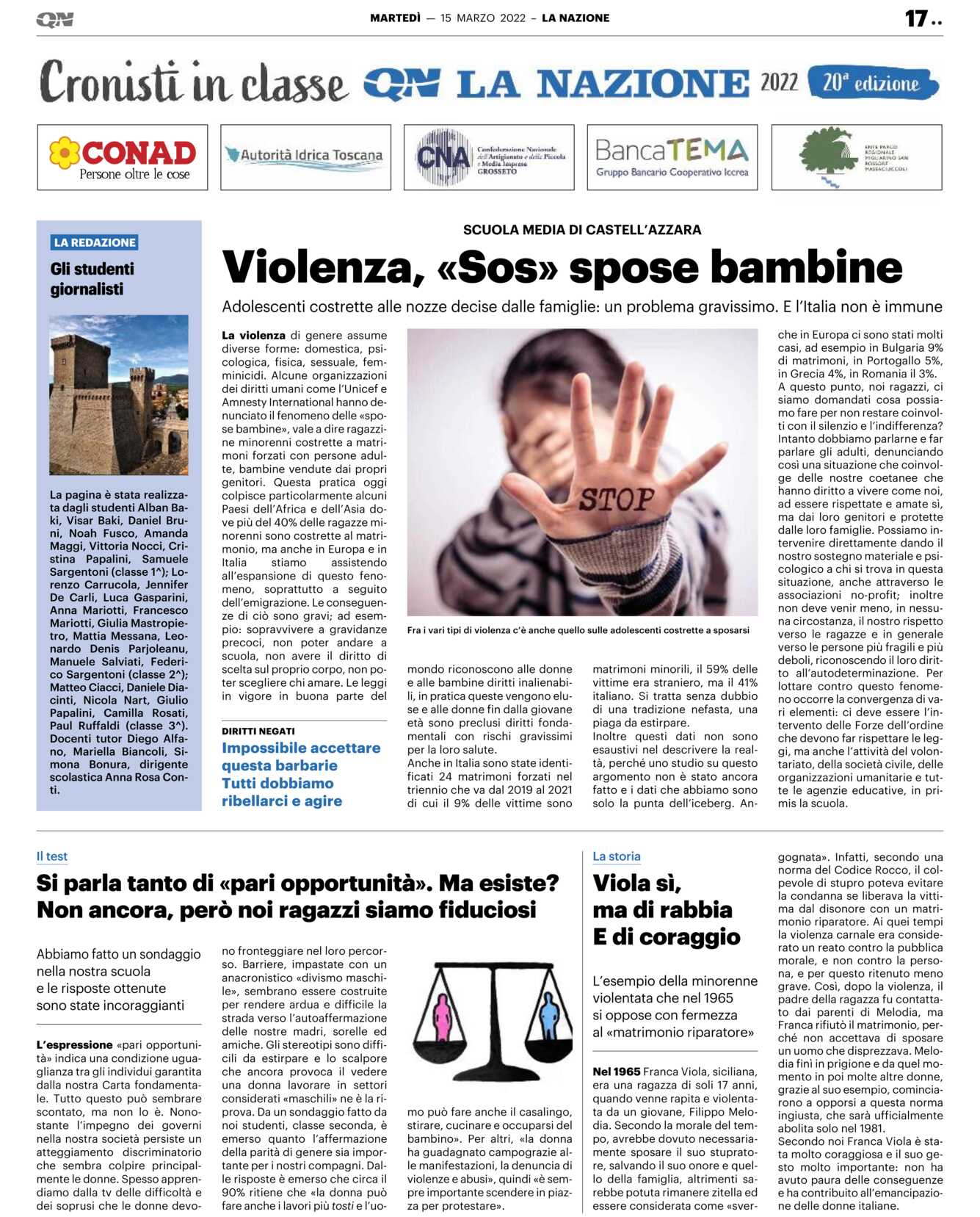 A questo punto, noi ragazzi, ci siamo domandati cosa possiamo fare per non restare coinvolti con il silenzio e l’indifferenza? Intanto dobbiamo parlarne e far parlare gli adulti, denunciando così una situazione che coinvolge delle nostre coetanee che hanno diritto a vivere come noi, ad essere rispettate e amate sì, ma dai loro genitori e protette dalle loro famiglie. Possiamo intervenire direttamente dando il nostro sostegno materiale e psicologico a chi si trova in questa situazione, anche attraverso le associazioni no-profit; inoltre non deve venir meno, in nessuna circostanza, il nostro rispetto verso le ragazze e in generale verso le persone più fragili e più deboli, riconoscendo il loro diritto all’autodeterminazione. Per lottare contro questo fenomeno occorre la convergenza di vari elementi: ci deve essere l’intervento delle Forze dell’ordine che devono far rispettare le leggi, ma anche l’attività del volontariato, della società civile, delle organizzazioni umanitarie e tutte le agenzie educative, in primis la scuola.