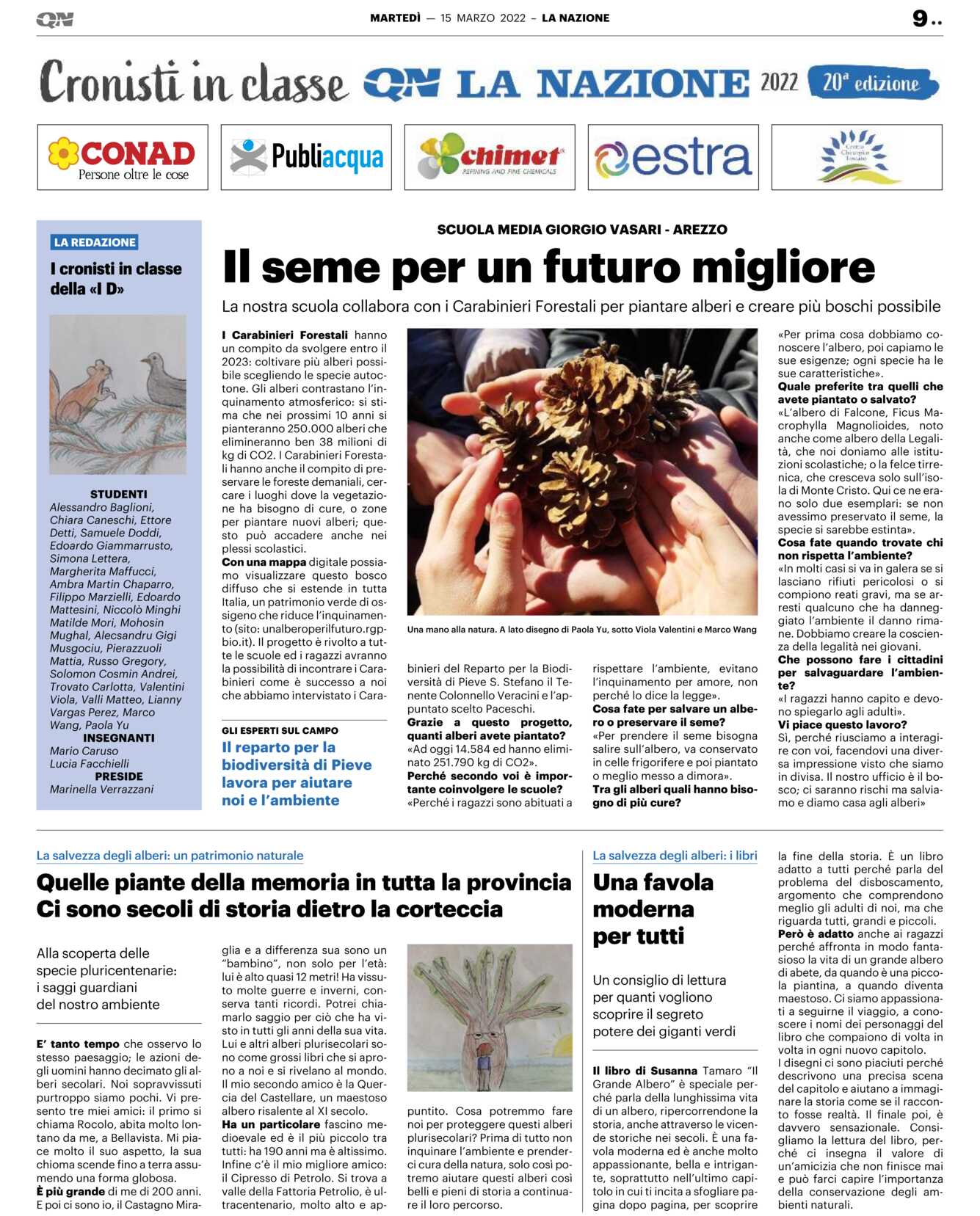 Con una mappa digitale possiamo visualizzare questo bosco diffuso che si estende in tutta Italia, un patrimonio verde di ossigeno che riduce l’inquinamento (sito: unalberoperilfuturo.rgpbio.it). Il progetto è rivolto a tutte le scuole ed i ragazzi avranno la possibilità di incontrare i Carabinieri come è successo a noi che abbiamo intervistato i Carabinieri del Reparto per la Biodiversità di Pieve S. Stefano il Tenente Colonnello Veracini e l’appuntato scelto Paceschi.