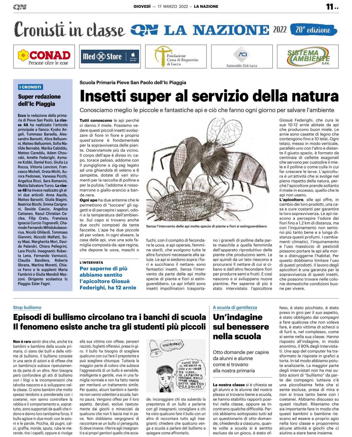 Ogni ape ha due antenne che le permettono di “toccare“ gli oggetti e di percepire i sapori, odori e la temperatura dell’ambiente. Sul capo si trovano anche due occhi composti da tante faccette. L’ape ha due piccole ali per volare. In ogni alveare, la casa delle api, vive una sola famiglia composta da: ape regina, che depone le uova, maschi o fuchi, con il compito di fecondare le uova, e api operaie, femmine sterili, che svolgono tutte le altre funzioni necessarie alla salute. Le api si siedono sopra i fiori e succhiano il nettare: sono fantastici insetti. Senza l’intervento da parte delle api molte specie di piante e fiori si estinguerebbero. Le api infatti sono insetti impollinatori: trasporta-no i granelli di polline dalla parte maschile a quella femminile dell’apparato riproduttivo delle piante che producono semi. Le api quindi da un lato riescono a procurarsi Il nettare di cui si cibano e dall’altro fecondare fiori per produrre semi e frutti. E così nascono e si sviluppano nuove piantine. Per saperne di più è stato intervistato l’apicoltore Giosuè Federighi, che cura le sue 10-12 arnie abitate da api che producono buon miele. Le arnie sono casette di legno che contengono fino a 10 telai. Ogni telaio, messo in modo verticale, parallelo uno con l’altro e distante il giusto spazio, è formato da centinaia di cellette esagonali che servono per custodire il miele e il polline o come culla in cui far crescere le larve. L’apicoltura è un’attività che si svolge nel pieno rispetto della natura, perché l’apicoltore prende soltanto il miele in eccesso, quello che le api non usano.
