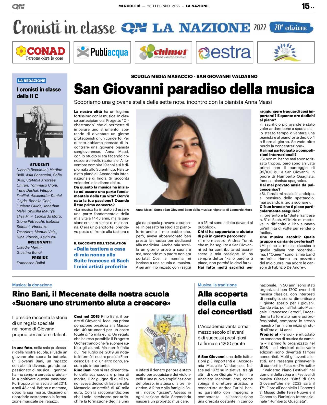 La nostra città ha un legame fortissimo con la musica. In classe partecipiamo al Progetto “Orchestrando” che ci permette di imparare uno strumento, sperando di diventare un giorno protagonisti di un concerto. Per questo abbiamo pensato di incontrare una giovane pianista sangiovannese, Anna Massi, con lo studio si sta facendo conoscere a livello nazionale. A novembre compirà 19 anni e si è diplomata allo Scientifico. Ha studiato piano all’Accademia Internazionale di Imola. Si racconta volentieri e le diamo del tu.