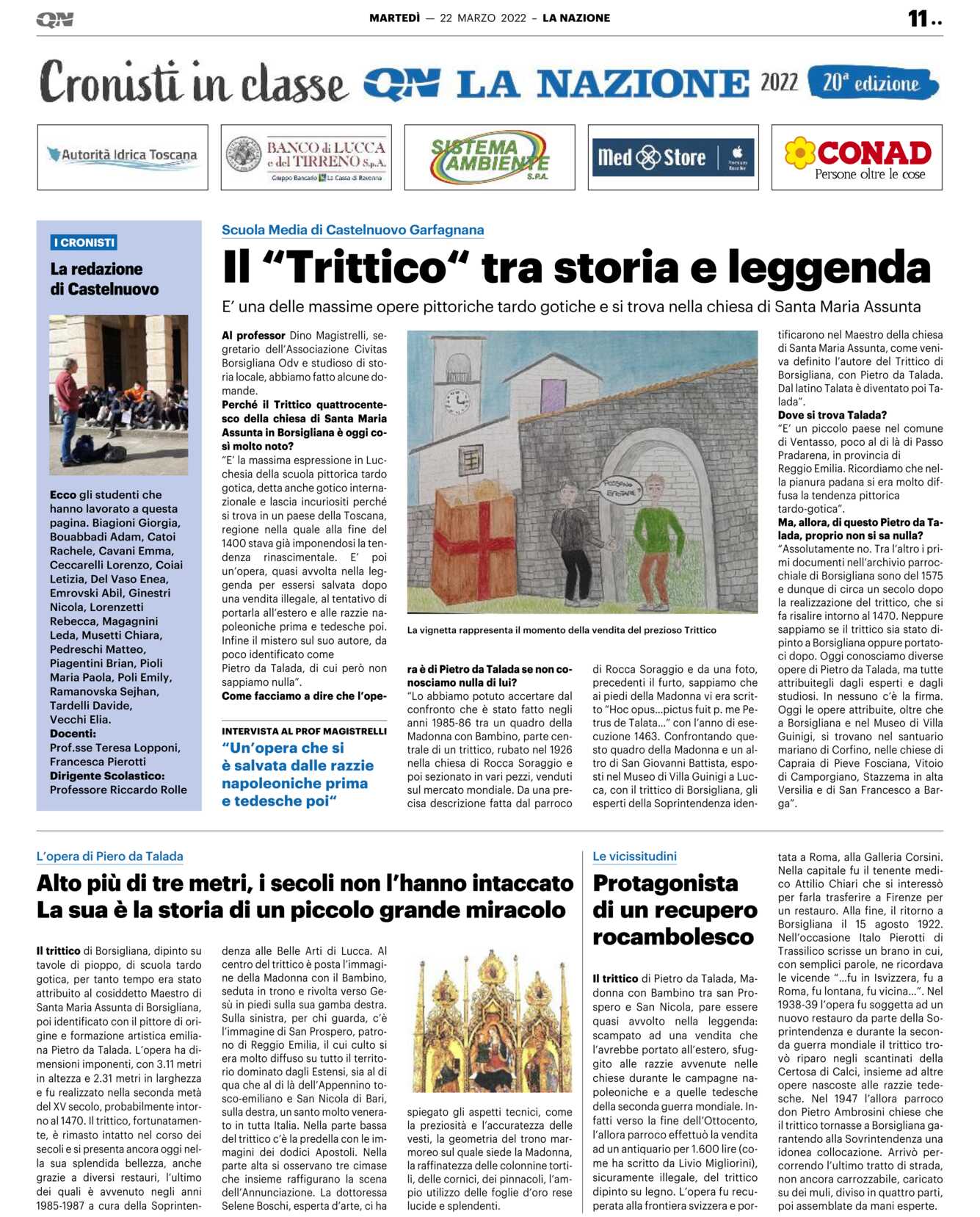 Come facciamo a dire che l’opera è di Pietro da Talada se non conosciamo nulla di lui? “Lo abbiamo potuto accertare dal confronto che è stato fatto negli anni 1985-86 tra un quadro della Madonna con Bambino, parte centrale di un trittico, rubato nel 1926 nella chiesa di Rocca Soraggio e poi sezionato in vari pezzi, venduti sul mercato mondiale. Da una precisa descrizione fatta dal parroco di Rocca Soraggio e da una foto, precedenti il furto, sappiamo che ai piedi della Madonna vi era scritto “Hoc opus…pictus fuit p. me Petrus de Talata…” con l’anno di esecuzione 1463. Confrontando questo quadro della Madonna e un altro di San Giovanni Battista, esposti nel Museo di Villa Guinigi a Lucca, con il trittico di Borsigliana, gli esperti della Soprintendenza identificarono nel Maestro della chiesa di Santa Maria Assunta, come veniva definito l’autore del Trittico di Borsigliana, con Pietro da Talada.