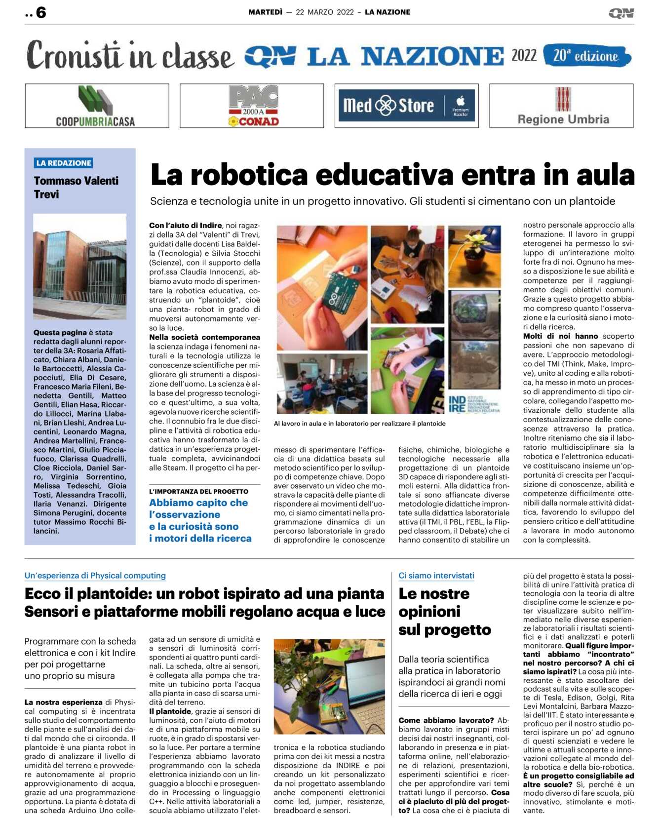 Con l’aiuto di Indire, noi ragazzi della 3A del “Valenti” di Trevi, guidati dalle docenti Lisa Baldella (Tecnologia) e Silvia Stocchi (Scienze), con il supporto della prof.ssa Claudia Innocenzi, abbiamo avuto modo di sperimentare la robotica educativa, costruendo un “plantoide“, cioè una pianta- robot in grado di muoversi autonomamente verso la luce.