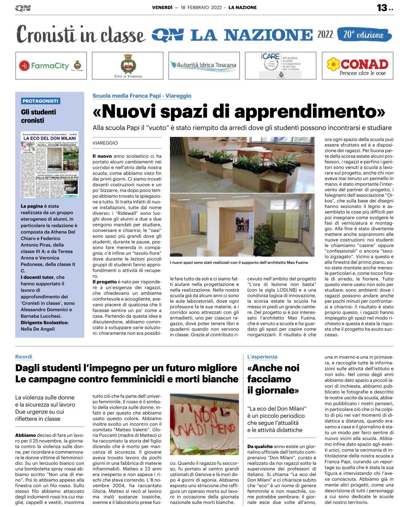VIAREGGIO Il nuovo anno scolastico ci ha portato alcuni cambiamenti nei corridoi e nell’atrio della nostra scuola, come abbiamo visto fin dai primi giorni. Ci siamo trovati davanti costruzioni nuove e un po’ bizzarre, ma dopo poco tempo abbiamo trovato la spiegazione a tutto. Si tratta infatti di nuove installazioni, tutte dal nome diverso: i “Ridewall” sono luoghi dove gli alunni a due a due vengono mandati per studiare, conversare e chiarirsi; le “oasi” sono spazi più grandi dove gli studenti, durante le pause, possono fare merenda in compagnia; c’è infine un “tavolo-fiore” dove durante le lezioni piccoli gruppi di studenti fanno approfondimenti o attività di recupero.