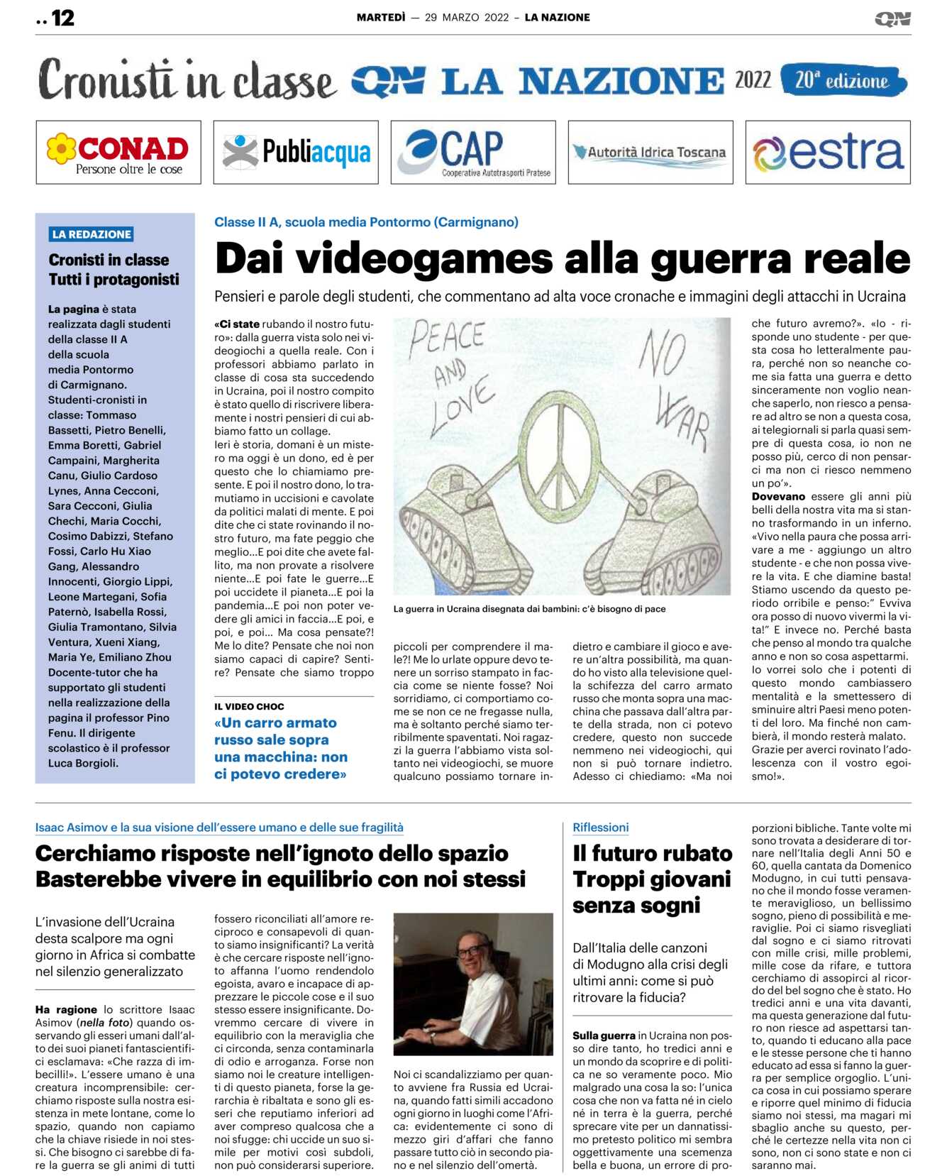 Adesso ci chiediamo: «Ma noi che futuro avremo?». «Io – risponde uno studente – per questa cosa ho letteralmente paura, perché non so neanche come sia fatta una guerra e detto sinceramente non voglio neanche saperlo, non riesco a pensare ad altro se non a questa cosa, ai telegiornali si parla quasi sempre di questa cosa, io non ne posso più, cerco di non pensarci ma non ci riesco nemmeno un po’».