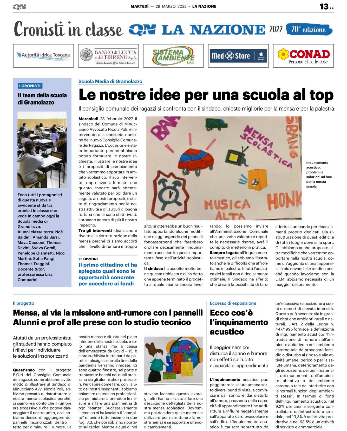 Tra gli interventi ideati, uno è rivolto alla ristrutturazione della mensa perché ci siamo accorti che il livello di rumore è troppo alto: si otterrebbe un buon risultato apportando alcune modifiche e aggiungendo dei pannelli fonoassorbenti che farebbero crollare decisamente l’inquinamento acustico in questa importante fase dell’attività scolastica.