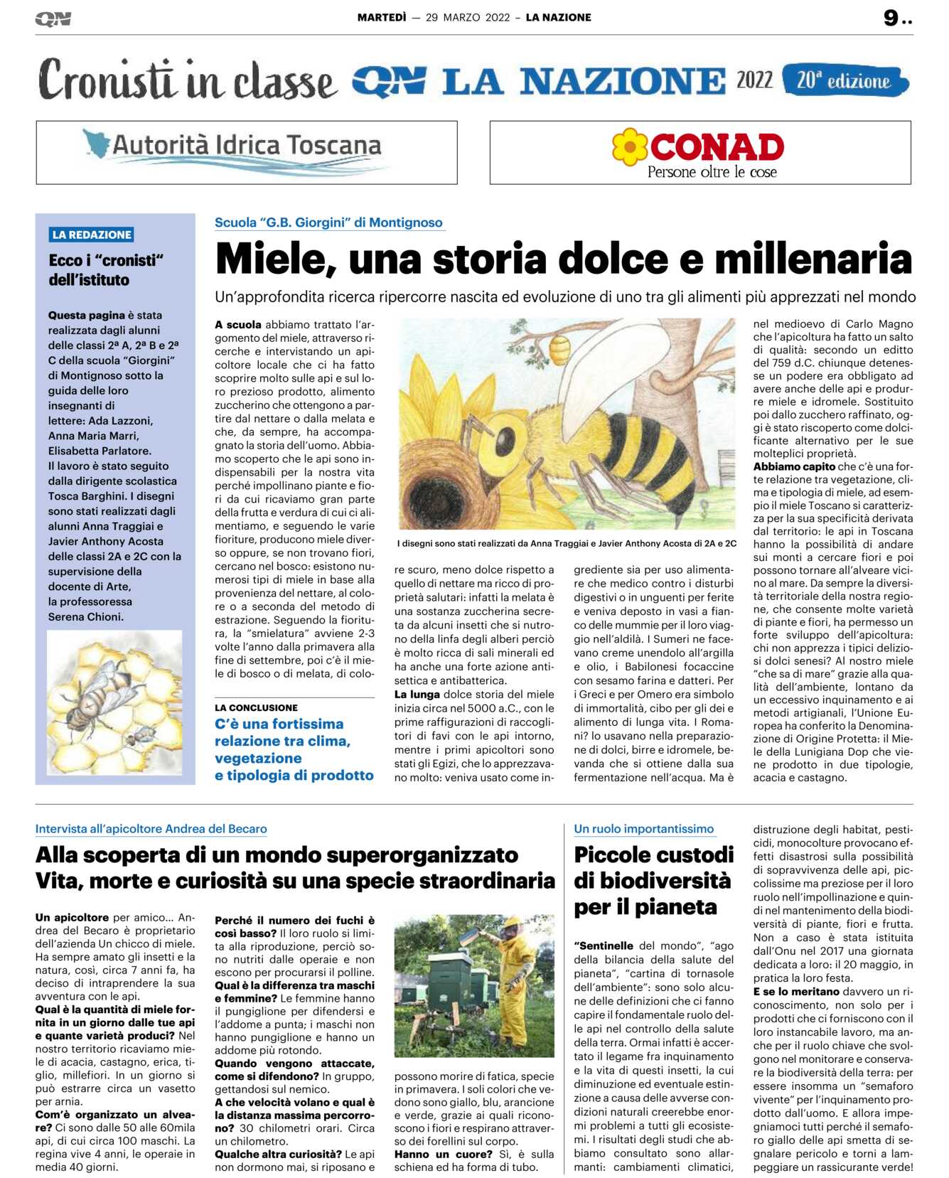 A scuola abbiamo trattato l’argomento del miele, attraverso ricerche e intervistando un apicoltore locale che ci ha fatto scoprire molto sulle api e sul loro prezioso prodotto, alimento zuccherino che ottengono a partire dal nettare o dalla melata e che, da sempre, ha accompagnato la storia dell’uomo. Abbiamo scoperto che le api sono indispensabili per la nostra vita perché impollinano piante e fiori da cui ricaviamo gran parte della frutta e verdura di cui ci alimentiamo, e seguendo le varie fioriture, producono miele diverso oppure, se non trovano fiori, cercano nel bosco: esistono numerosi tipi di miele in base alla provenienza del nettare, al colore o a seconda del metodo di estrazione. Seguendo la fioritura, la “smielatura” avviene 2-3 volte l’anno dalla primavera alla fine di settembre, poi c’è il miele di bosco o di melata, di colo-re scuro, meno dolce rispetto a quello di nettare ma ricco di proprietà salutari: infatti la melata è una sostanza zuccherina secreta da alcuni insetti che si nutrono della linfa degli alberi perciò è molto ricca di sali minerali ed ha anche una forte azione antisettica e antibatterica.