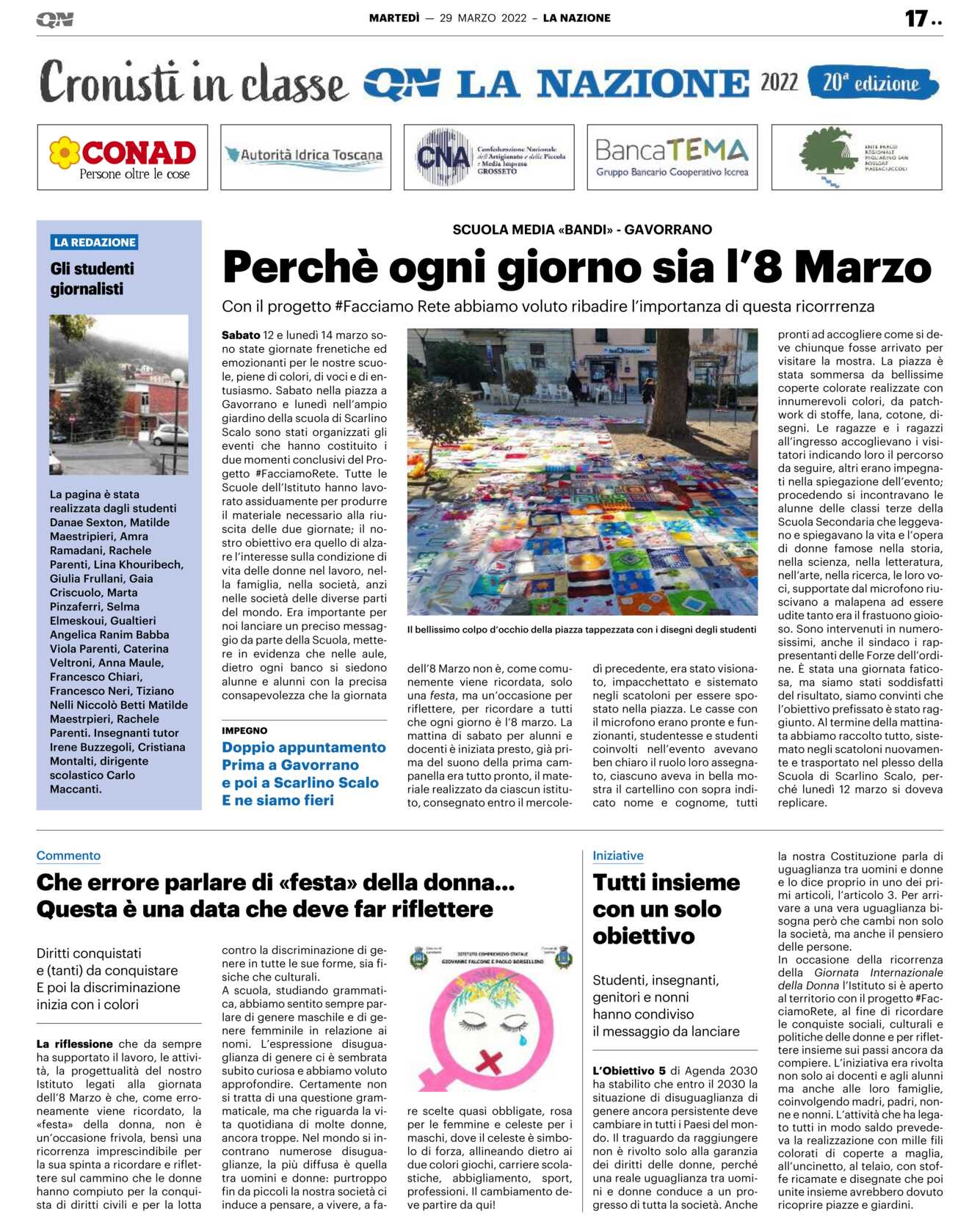 Sabato 12 e lunedì 14 marzo sono state giornate frenetiche ed emozionanti per le nostre scuole, piene di colori, di voci e di entusiasmo. Sabato nella piazza a Gavorrano e lunedì nell’ampio giardino della scuola di Scarlino Scalo sono stati organizzati gli eventi che hanno costituito i due momenti conclusivi del Progetto #FacciamoRete. Tutte le Scuole dell’Istituto hanno lavorato assiduamente per produrre il materiale necessario alla riuscita delle due giornate; il nostro obiettivo era quello di alzare l’interesse sulla condizione di vita delle donne nel lavoro, nella famiglia, nella società, anzi nelle società delle diverse parti del mondo. Era importante per noi lanciare un preciso messaggio da parte della Scuola, mettere in evidenza che nelle aule, dietro ogni banco si siedono alunne e alunni con la precisa consapevolezza che la giornatadell’8 Marzo non è, come comunemente viene ricordata, solo una festa, ma un’occasione per riflettere, per ricordare a tutti che ogni giorno è l’8 marzo. La mattina di sabato per alunni e docenti è iniziata presto, già prima del suono della prima campanella era tutto pronto, il materiale realizzato da ciascun istituto, consegnato entro il mercoledì precedente, era stato visionato, impacchettato e sistemato negli scatoloni per essere spostato nella piazza. Le casse con il microfono erano pronte e funzionanti, studentesse e studenti coinvolti nell’evento avevano ben chiaro il ruolo loro assegnato, ciascuno aveva in bella mostra il cartellino con sopra indicato nome e cognome, tutti pronti ad accogliere come si deve chiunque fosse arrivato per visitare la mostra. La piazza è stata sommersa da bellissime coperte colorate realizzate con innumerevoli colori, da patchwork di stoffe, lana, cotone, disegni. Le ragazze e i ragazzi all’ingresso accoglievano i visitatori indicando loro il percorso da seguire, altri erano impegnati nella spiegazione dell’evento; procedendo si incontravano le alunne delle classi terze della Scuola Secondaria che leggevano e spiegavano la vita e l’opera di donne famose nella storia, nella scienza, nella letteratura, nell’arte, nella ricerca, le loro voci, supportate dal microfono riuscivano a malapena ad essere udite tanto era il frastuono gioioso. Sono intervenuti in numerosissimi, anche il sindaco i rappresentanti delle Forze dell’ordine. È stata una giornata faticosa, ma siamo stati soddisfatti del risultato, siamo convinti che l’obiettivo prefissato è stato raggiunto. Al termine della mattinata abbiamo raccolto tutto, sistemato negli scatoloni nuovamente e trasportato nel plesso della Scuola di Scarlino Scalo, perché lunedì 12 marzo si doveva replicare.
