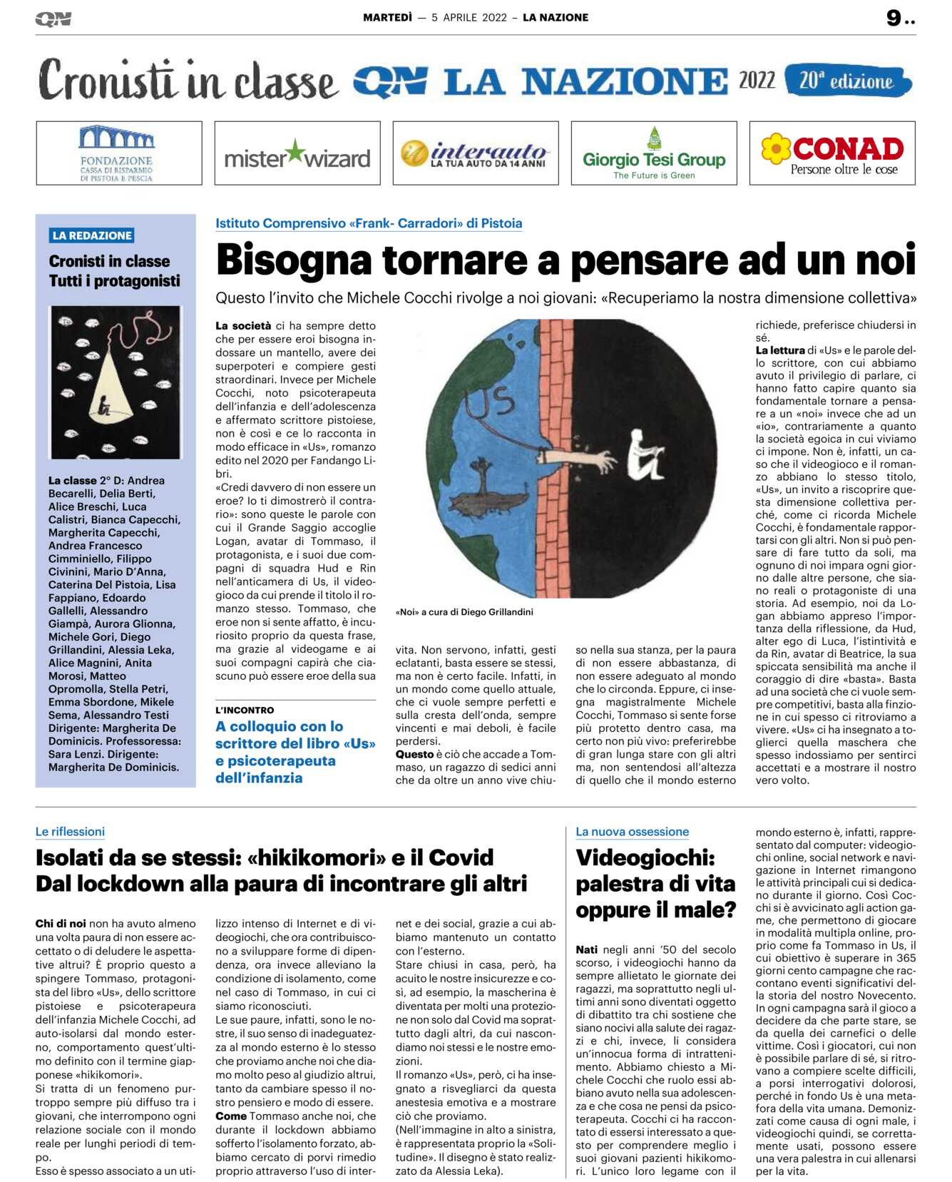 La lettura di «Us» e le parole dello scrittore, con cui abbiamo avuto il privilegio di parlare, ci hanno fatto capire quanto sia fondamentale tornare a pensare a un «noi» invece che ad un «io», contrariamente a quanto la società egoica in cui viviamo ci impone. Non è, infatti, un caso che il videogioco e il romanzo abbiano lo stesso titolo, «Us», un invito a riscoprire questa dimensione collettiva perché, come ci ricorda Michele Cocchi, è fondamentale rapportarsi con gli altri. Non si può pensare di fare tutto da soli, ma ognuno di noi impara ogni giorno dalle altre persone, che siano reali o protagoniste di una storia. Ad esempio, noi da Logan abbiamo appreso l’importanza della riflessione, da Hud, alter ego di Luca, l’istintività e da Rin, avatar di Beatrice, la sua spiccata sensibilità ma anche il coraggio di dire «basta». Basta ad una società che ci vuole sempre competitivi, basta alla finzione in cui spesso ci ritroviamo a vivere. «Us» ci ha insegnato a toglierci quella maschera che spesso indossiamo per sentirci accettati e a mostrare il nostro vero volto.