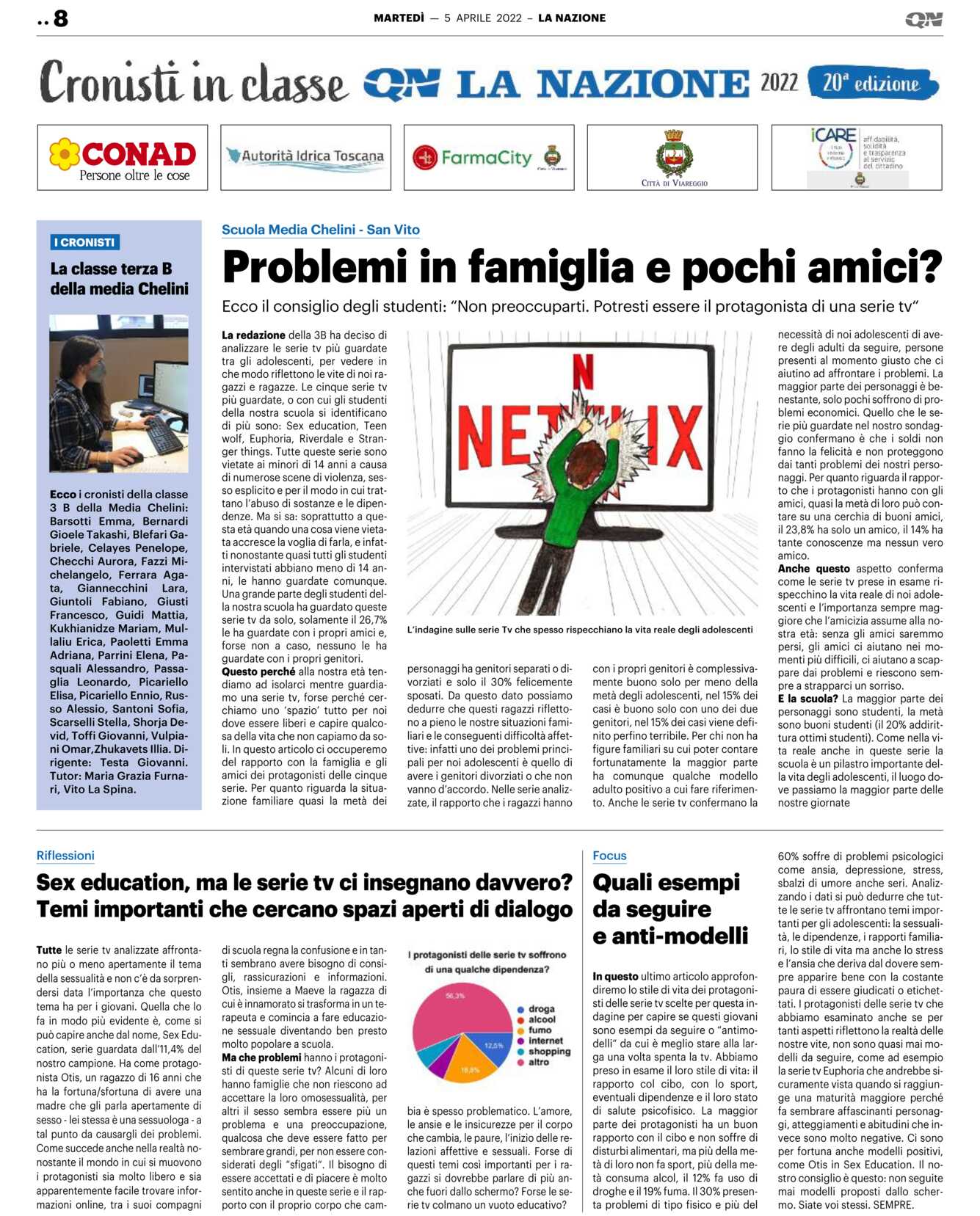 La redazione della 3B ha deciso di analizzare le serie tv più guardate tra gli adolescenti, per vedere in che modo riflettono le vite di noi ragazzi e ragazze. Le cinque serie tv più guardate, o con cui gli studenti della nostra scuola si identificano di più sono: Sex education, Teen wolf, Euphoria, Riverdale e Stranger things. Tutte queste serie sono vietate ai minori di 14 anni a causa di numerose scene di violenza, sesso esplicito e per il modo in cui trattano l’abuso di sostanze e le dipendenze. Ma si sa: soprattutto a questa età quando una cosa viene vietata accresce la voglia di farla, e infatti nonostante quasi tutti gli studenti intervistati abbiano meno di 14 anni, le hanno guardate comunque.