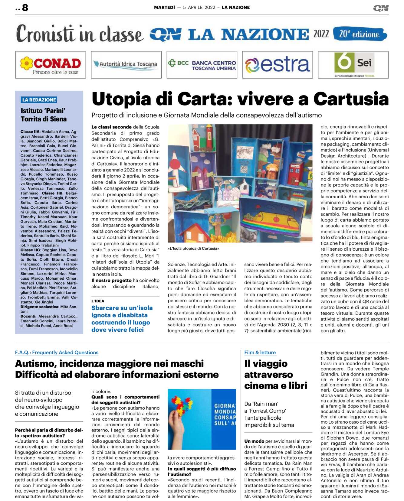 Le classi seconde della Scuola Secondaria di primo grado dell’Istituto Comprensivo «G. Parini» di Torrita di Siena hanno partecipato al Progetto di Educazione Civica, «L’isola utopica di Cartusia». Il laboratorio è iniziato a gennaio 2022 e si concluderà il giorno 2 aprile, in occasione della Giornata Mondiale della consapevolezza dell’autismo. Il presupposto del progetto è che l’utopia sia un’“immaginazione democratica”: un sogno comune da realizzare insieme confrontandosi e divertendosi, imparando e guardando la realtà con occhi “diversi”. L’isola sarà costruita interamente di carta perché ci siamo ispirati al testo “La vera storia di Cartusia” e al libro del filosofo L. Mori “I misteri dell’isola di Utopia” da cui abbiamo tratto la mappa della nostra isola.