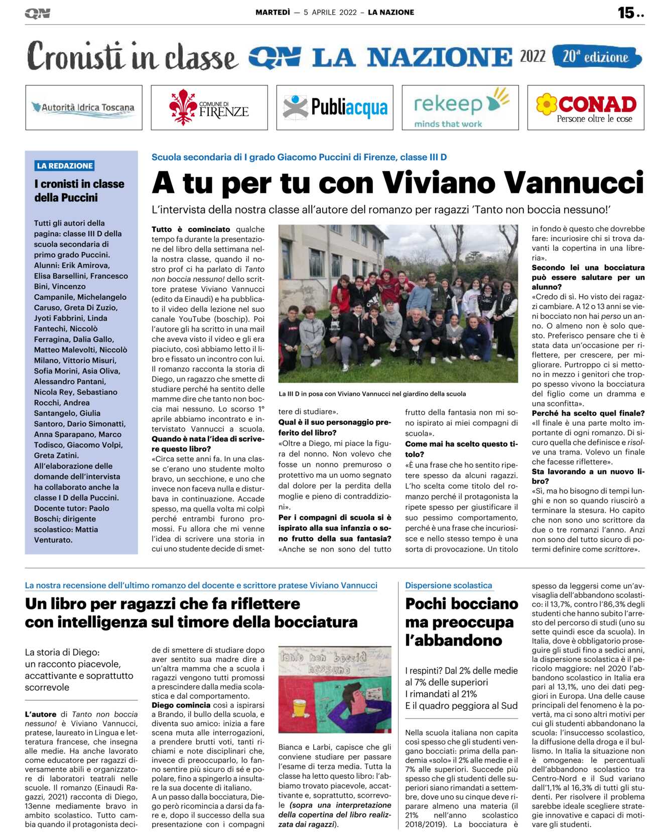 Tutto è cominciato qualche tempo fa durante la presentazione del libro della settimana nella nostra classe, quando il nostro prof ci ha parlato di Tanto non boccia nessuno! dello scrittore pratese Viviano Vannucci (edito da Einaudi) e ha pubblicato il video della lezione nel suo canale YouTube (boschip). Poi l’autore gli ha scritto in una mail che aveva visto il video e gli era piaciuto, così abbiamo letto il libro e fissato un incontro con lui. Il romanzo racconta la storia di Diego, un ragazzo che smette di studiare perché ha sentito delle mamme dire che tanto non boccia mai nessuno. Lo scorso 1° aprile abbiamo incontrato e intervistato Vannucci a scuola.