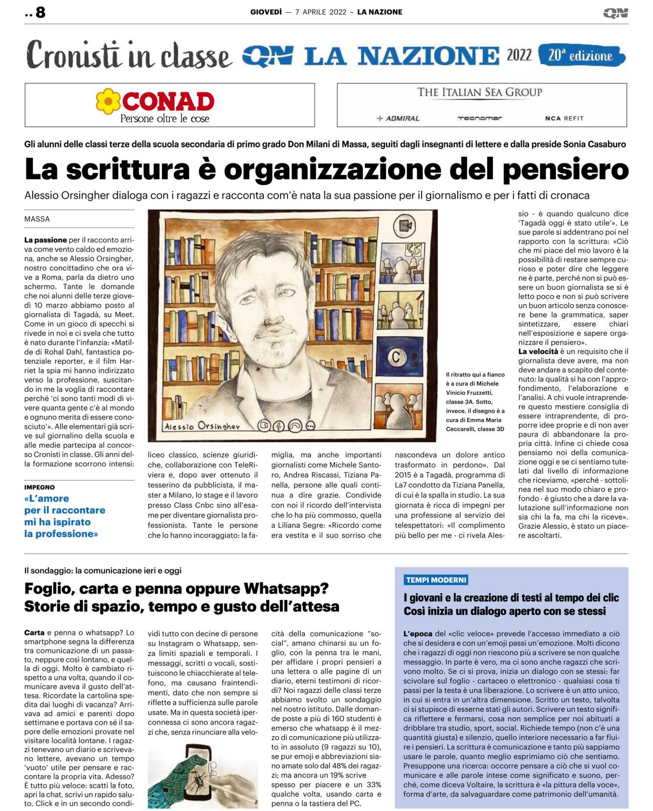 MASSA La passione per il racconto arriva come vento caldo ed emoziona, anche se Alessio Orsingher, nostro concittadino che ora vive a Roma, parla da dietro uno schermo. Tante le domande che noi alunni delle terze giovedì 10 marzo abbiamo posto al giornalista di Tagadà, su Meet.